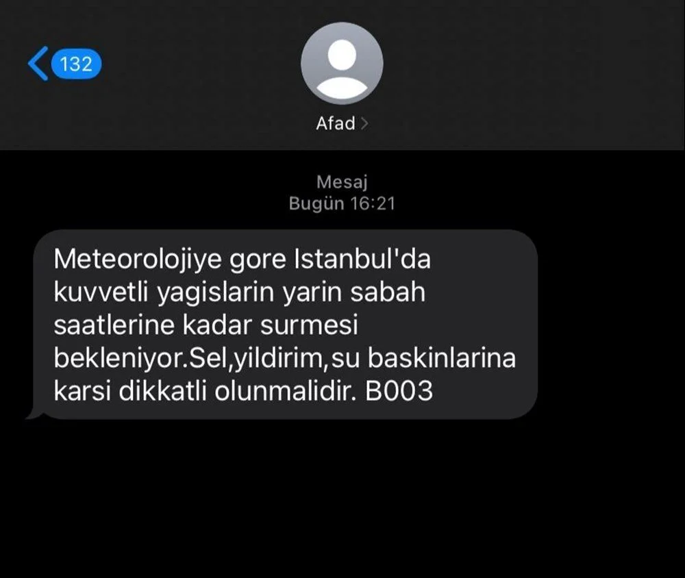 AFAD'ın, vatandaşların telefonlarına gönderdiği kısa mesajda da "Meteorolojiye göre, İstanbul'da kuvvetli yağışların yarın sabah saatlerine kadar sürmesi bekleniyor. Sel, yıldırım, su baskınlarına karşı dikkatli olunmalıdır." uyarısında bulunuldu.