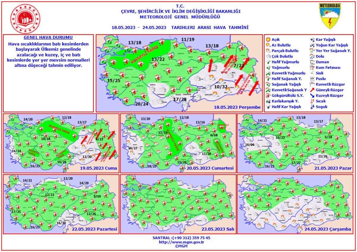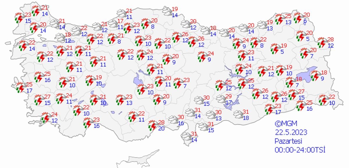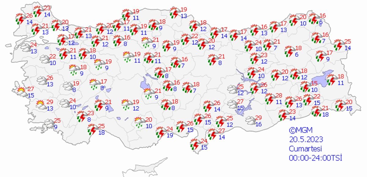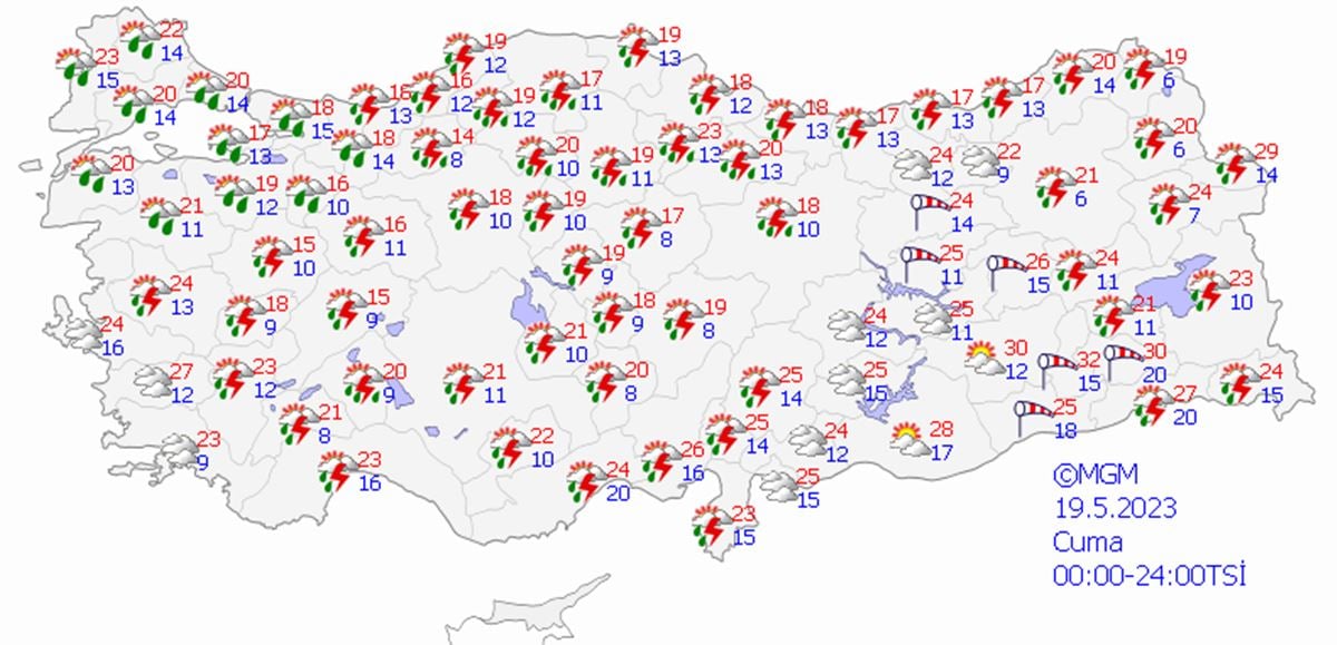 Yurdun kuzey, iç ve batı kesimleri parçalı, yer yer çok bulutlu, Marmara, Kuzey ve İç Ege, Göller Yöresi, İç Anadolu (Karaman hariç), Batı ve Orta Karadeniz'in iç kesimleri, Doğu Karadeniz kıyıları ile Zonguldak, Bartın, Kars, Ardahan, Ağrı ve Iğdır çevrelerinin aralıklı sağanak ve gök gürültülü sağanak yağışlı, diğer yerlerin az bulutlu ve açık geçeceği tahmin ediliyor. Yağışların Marmara'nın güney ve batısı, İç Ege, İç Anadolu’nun kuzeybatısı ile Bolu ve Karabük çevrelerinde yerel olarak kuvvetli olması bekleniyor.