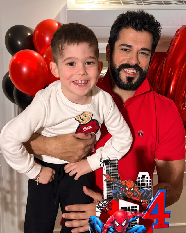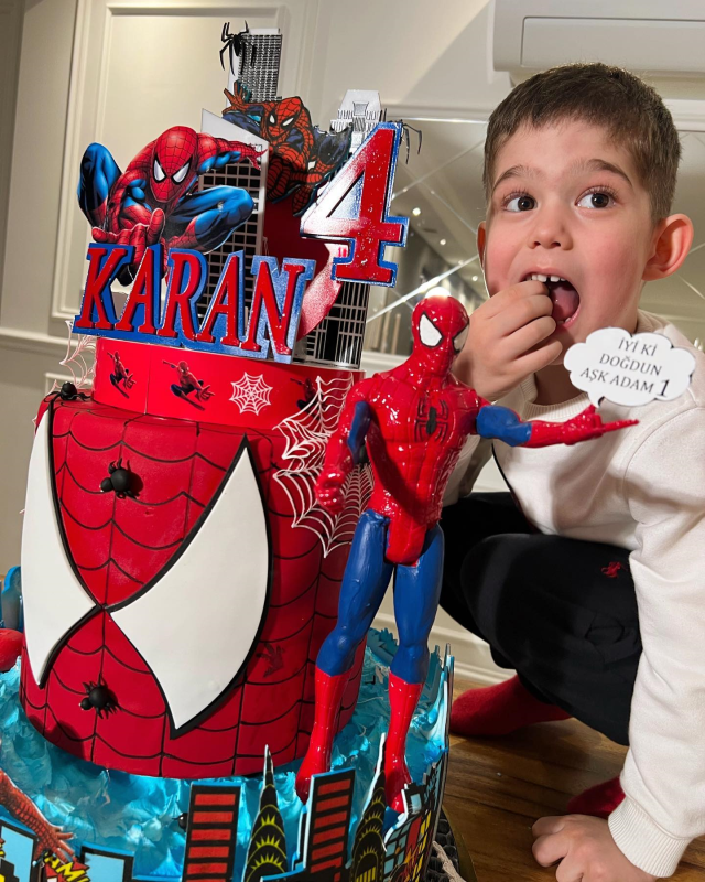 Spider-Man temalı bir pasta ile kırmızı konseptini seçen Burak Özçivit ve Fahriye Evcen, kırmızı kıyafet tercihleriyle de dikkat çekti.