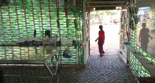 İçtiğiniz su şişelerini atmadan önce bir kez daha düşünün. Phonm Penh'in hemen dışında Koh Dach adasındaki Coconut Okulu'nda şişeler ustaca kesilmiş ve farklı renklerde boyanmış. Daha sonra bir Kamboçya bayrağı oluşturmak üzere biraraya getirilmiş.