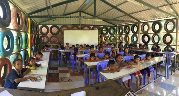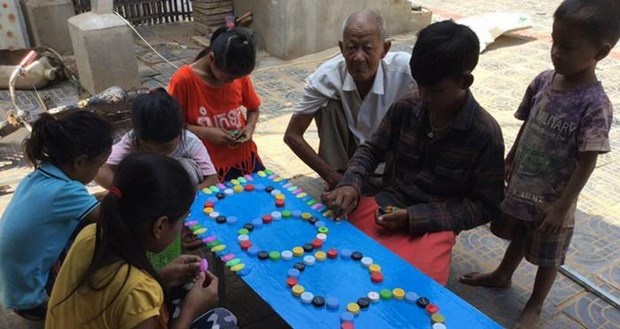 Öğrenciler çöplerin geri dönüşümü, yeniden kullanımı ve el zanaatı konularında özel dersler alıyor. Böylece kendi projelerini uygulayabiliyorlar. Okulun kurucusu Ouk Vanday, sadece çevredeki atıkların azaltılmasına yardımcı olmakla kalmayıp aynı zamanda çocukların yaratıcı düşünmelerini de istiyor. Bu fotoğrafta çocuklar okul tabelasını plastik kaşık ve şişe kapaklarıyla süslüyor.