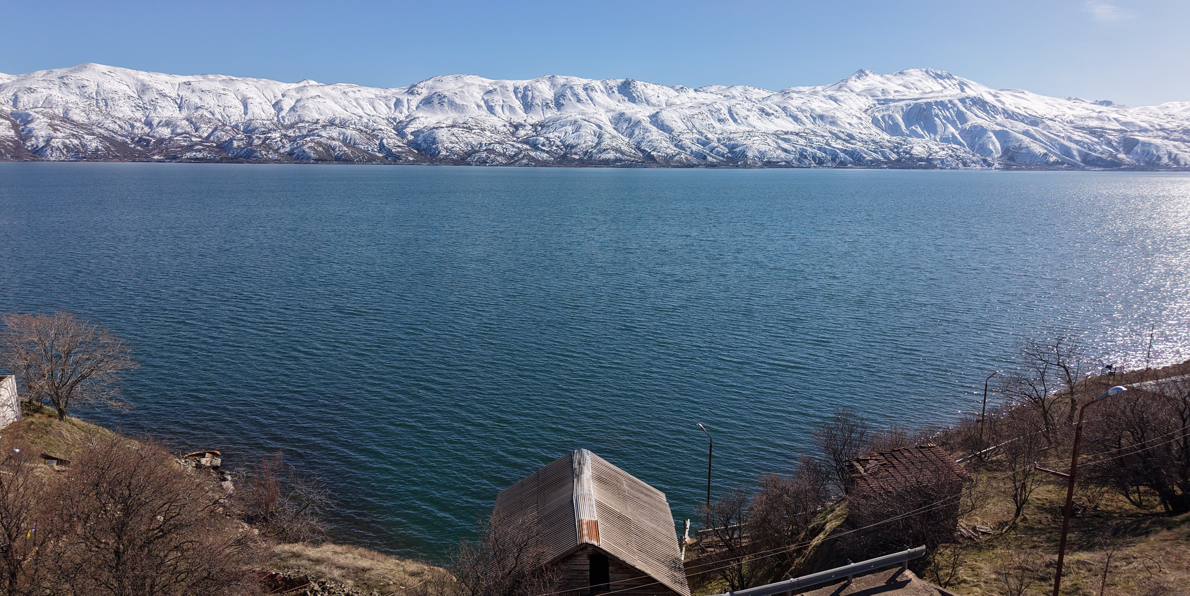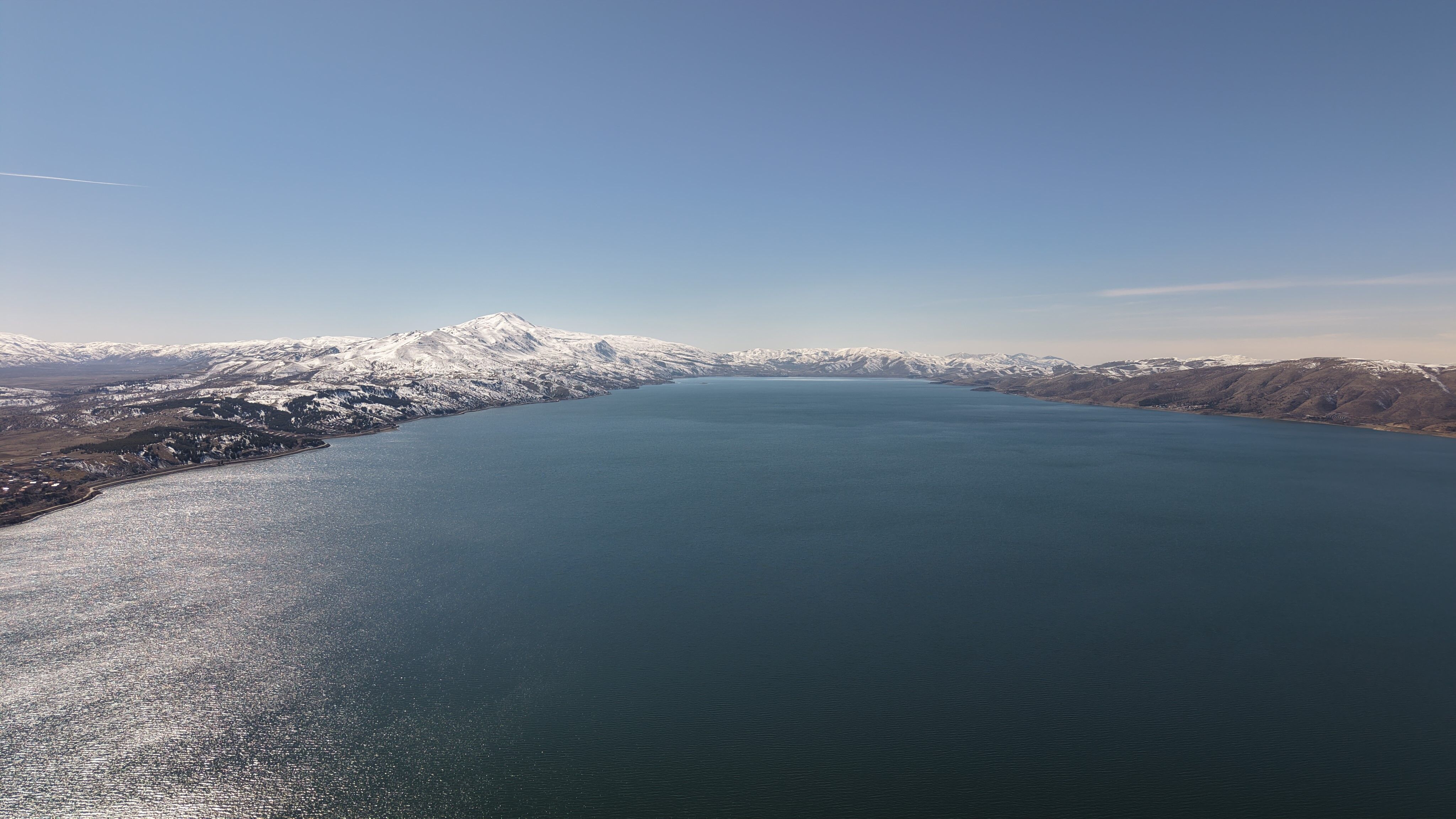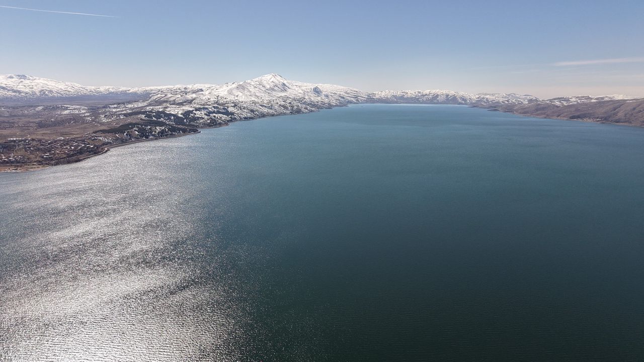 Karla kaplı dağlar ile gölün mavi sularının birleştiği o anlar, havadan görüntülendi.