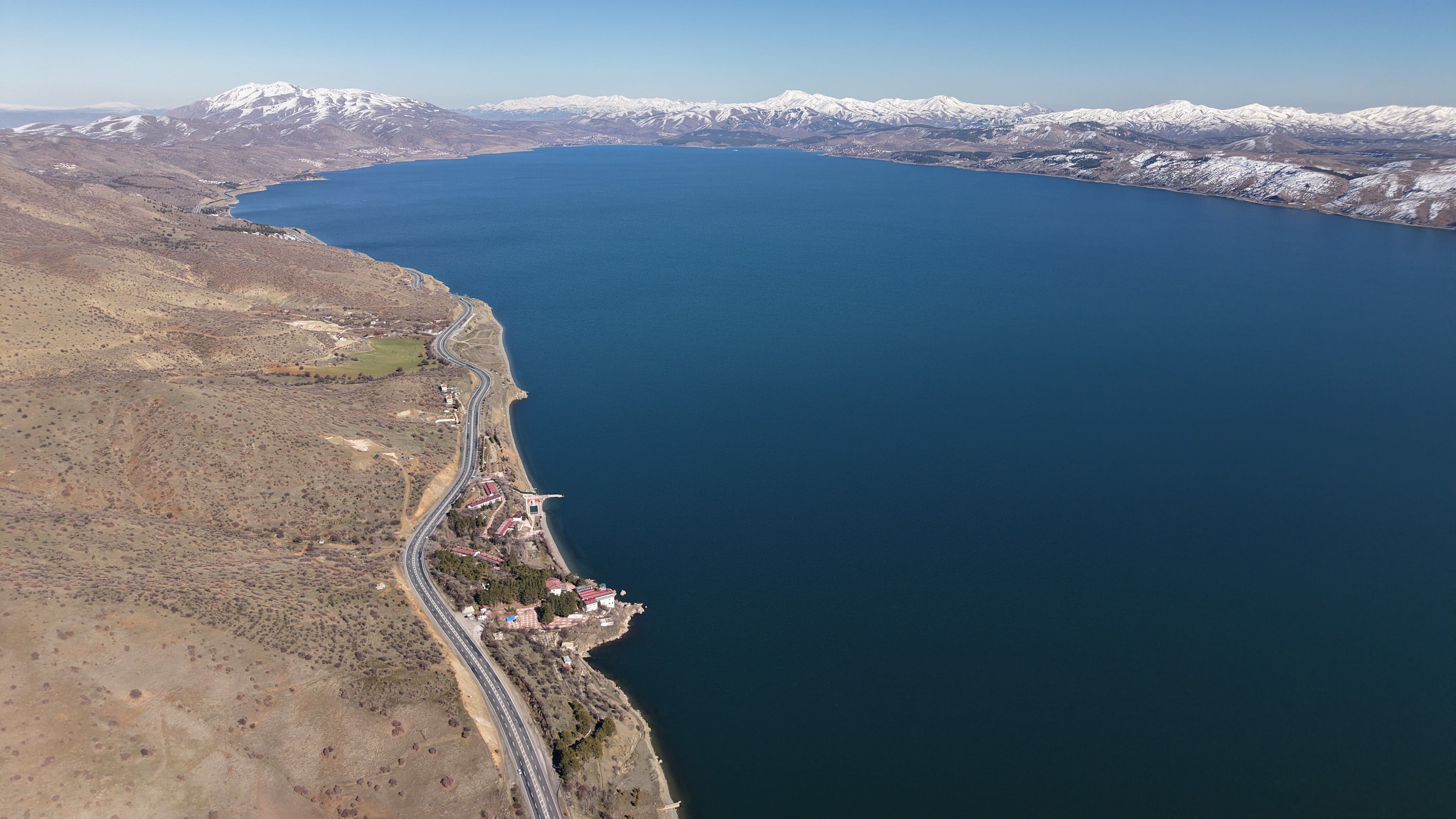 Hazar Gölü'nün maviliği, Hazarbaba Dağı'nın beyazlığı ve güneşin parlaklığı birleşerek bölgede kartpostallık görüntüler oluştu.