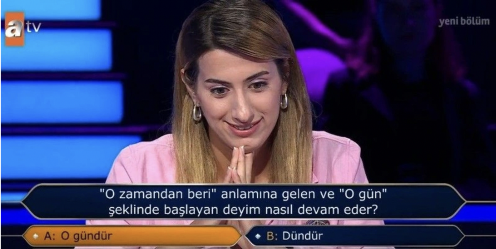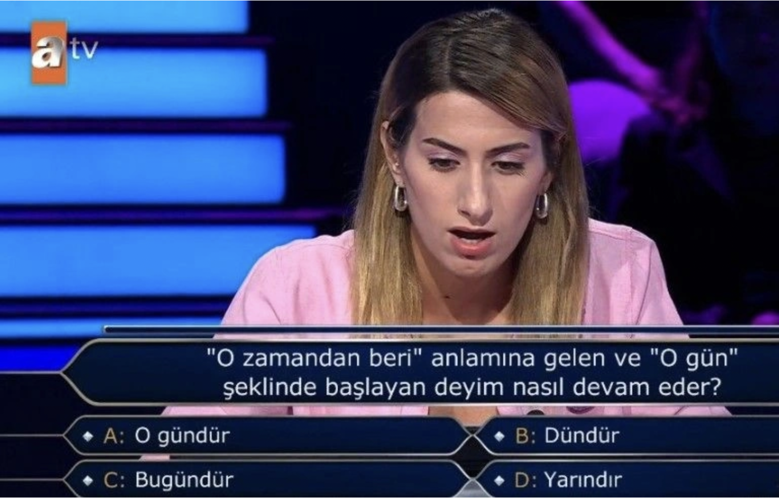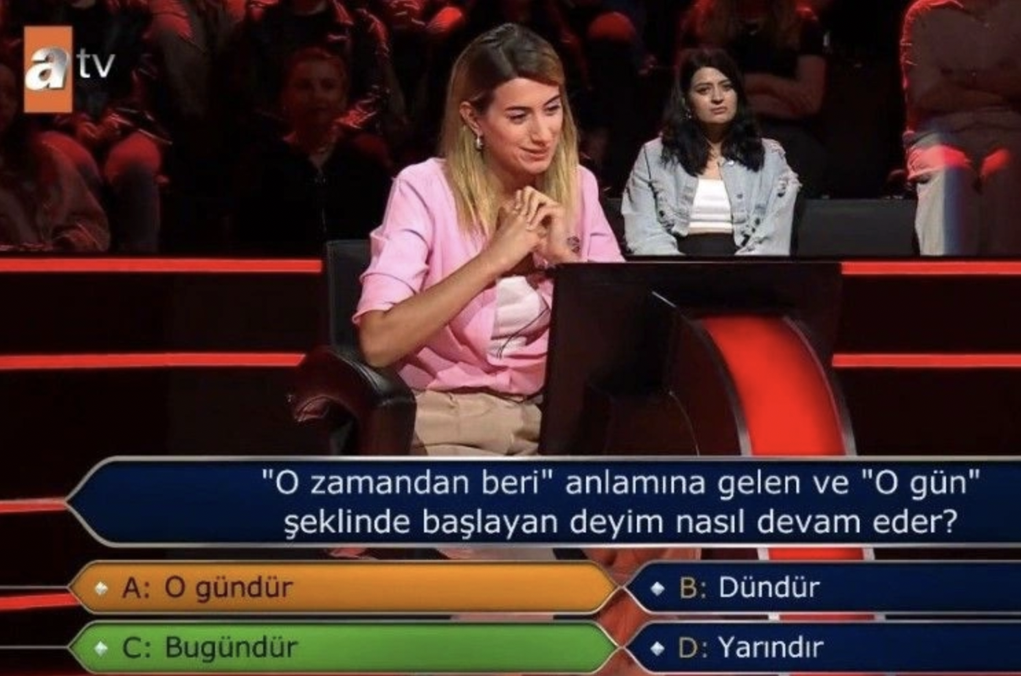 Üçüncü soruda yarışmacının karşısına, "O zamandan beri anlamına gelen ve 'o gün' şeklinde başlayan deyim nasıl devam eder?" sorusu çıktı.
