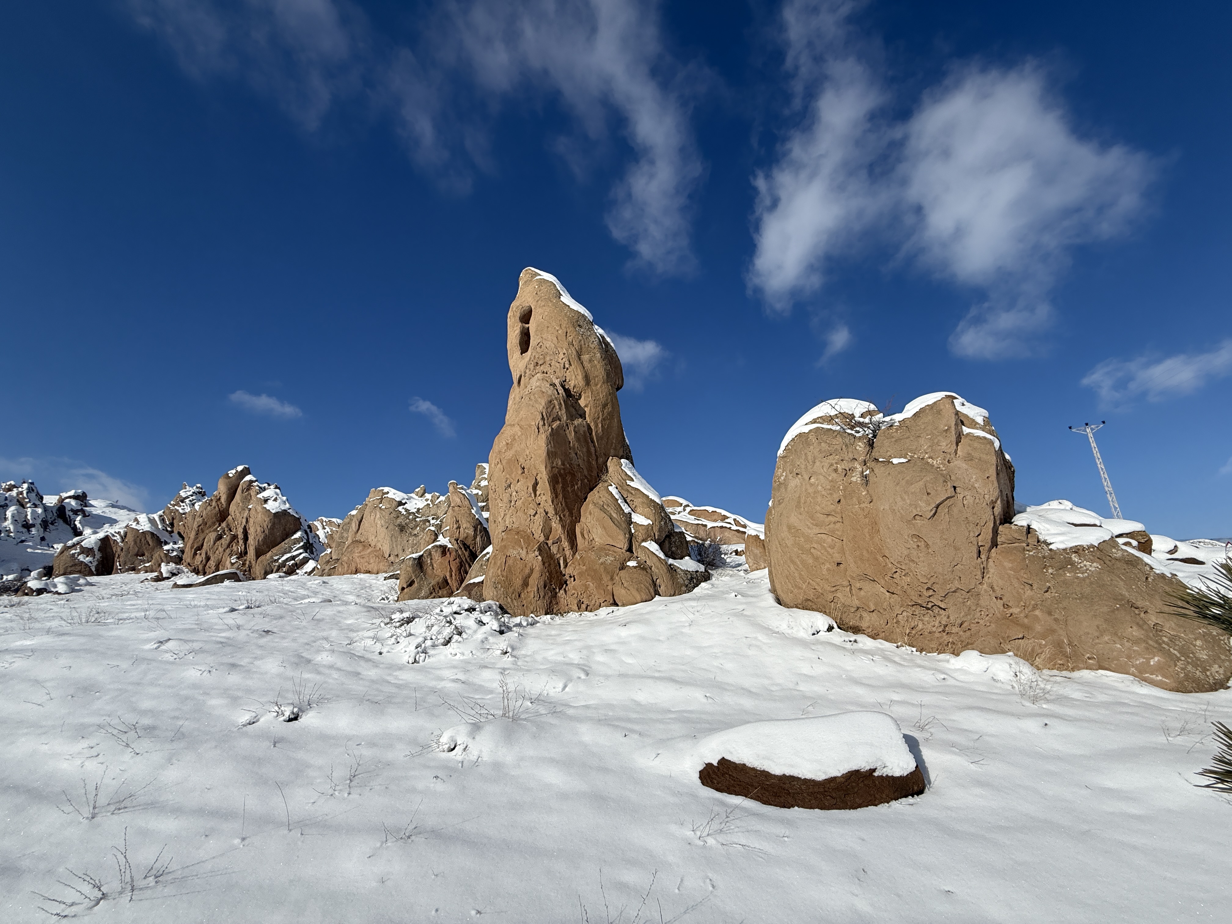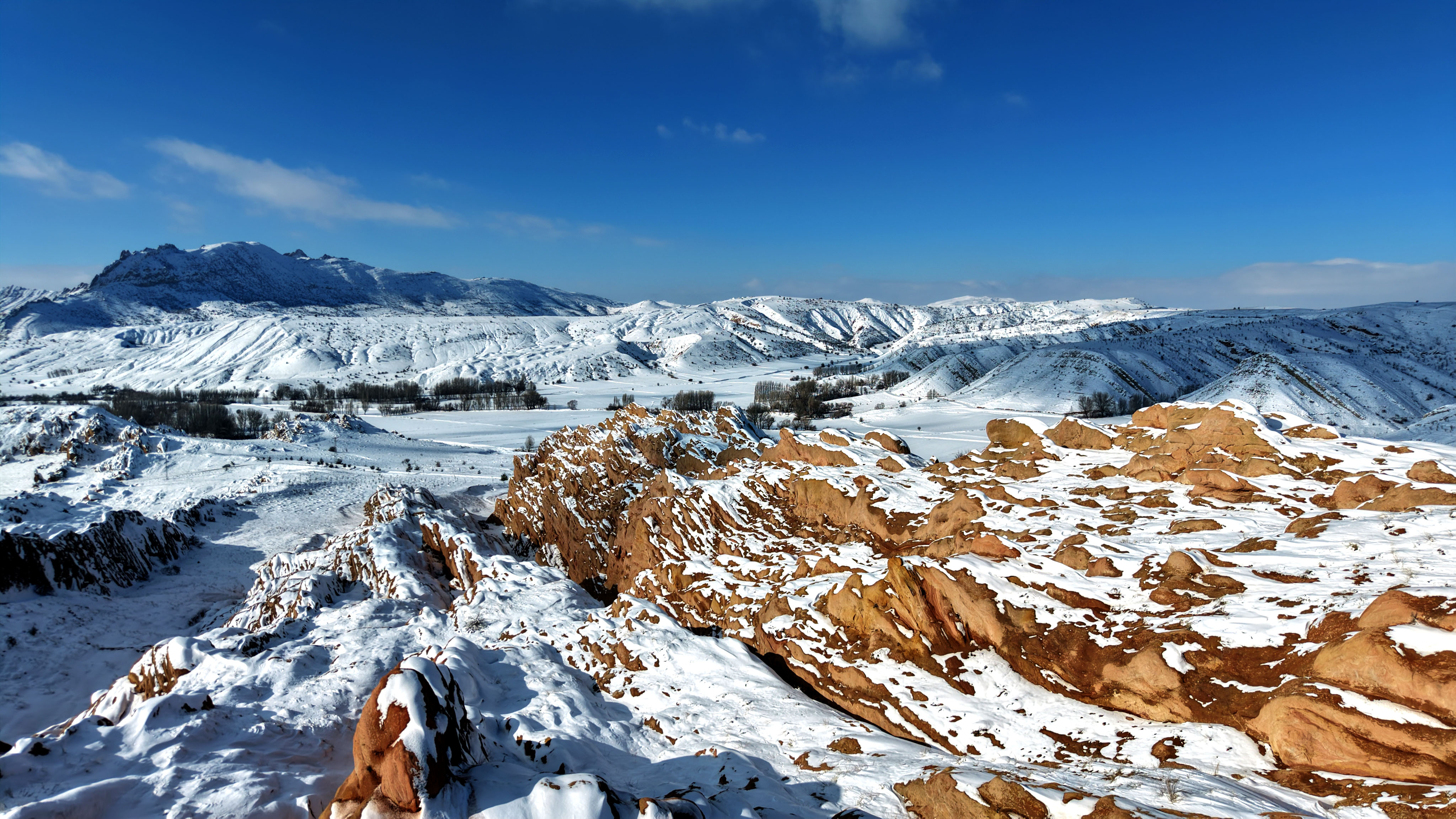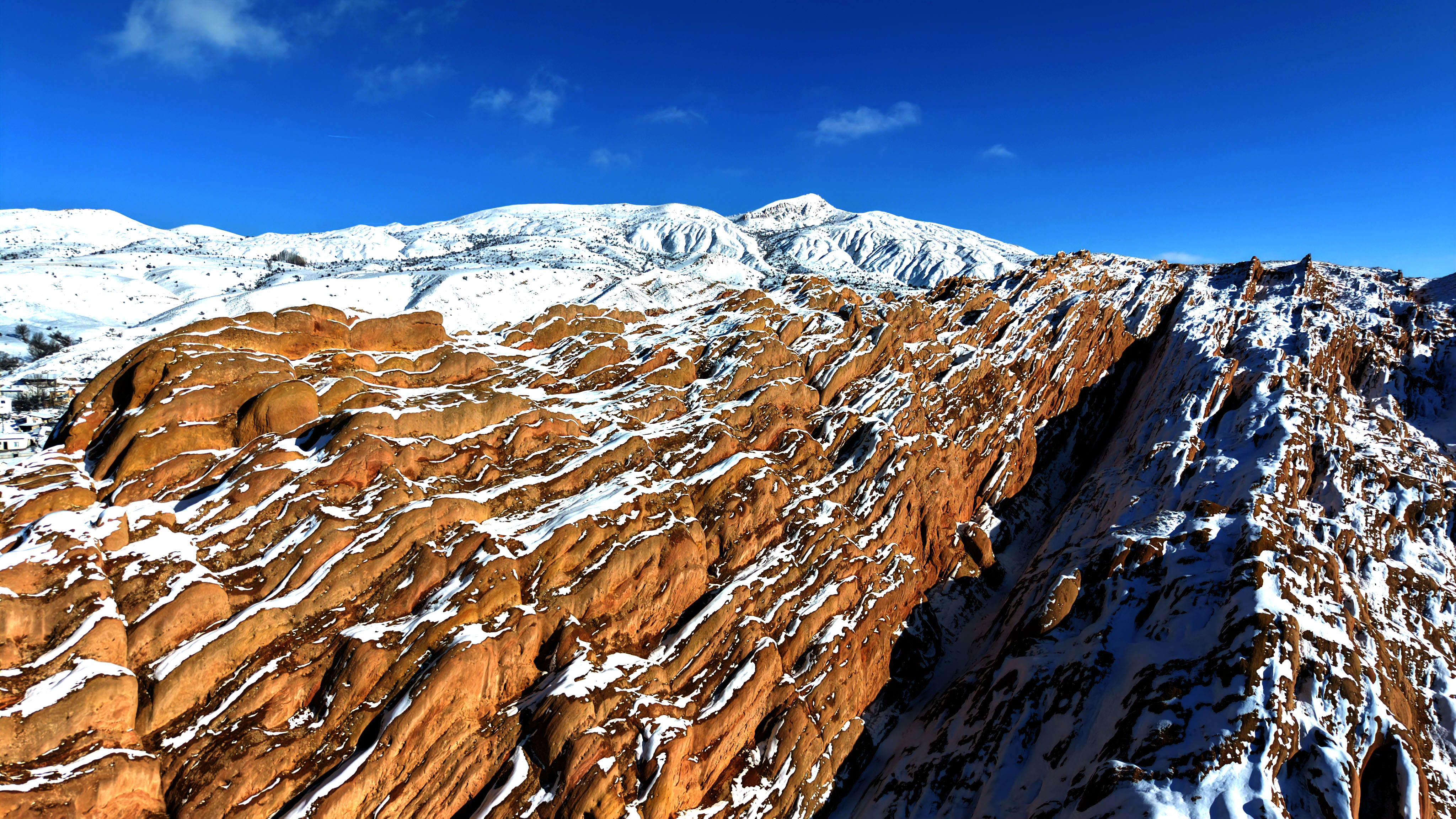 Yüzeyinde çamur ve kum taşlarının oluşturduğu kızıllık nedeniyle farklılık gösteren ve özellikle yaz aylarında meraklıların sıkça ziyaret ettiği kayalıklarda kar yağışı sonrası ortaya çıkan manzara dron ile görüntülendi. Kar yağışı ile geniş bir alanı kaplayan kayalıkların yüzeyinde oluşan beyaz örtü, kızıl zeminle birlikte güzel görüntüler oluşturdu.
