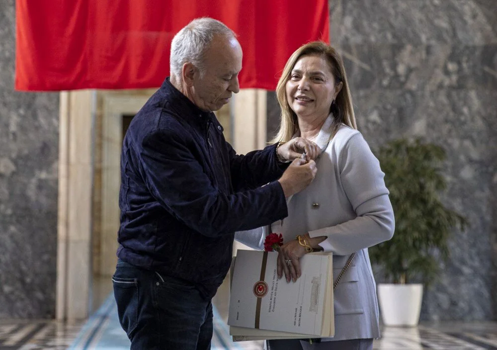 Açıklamanın ardından Ersoy'a rozetini eşi Prof. Dr. Emin Ersoy taktı.
