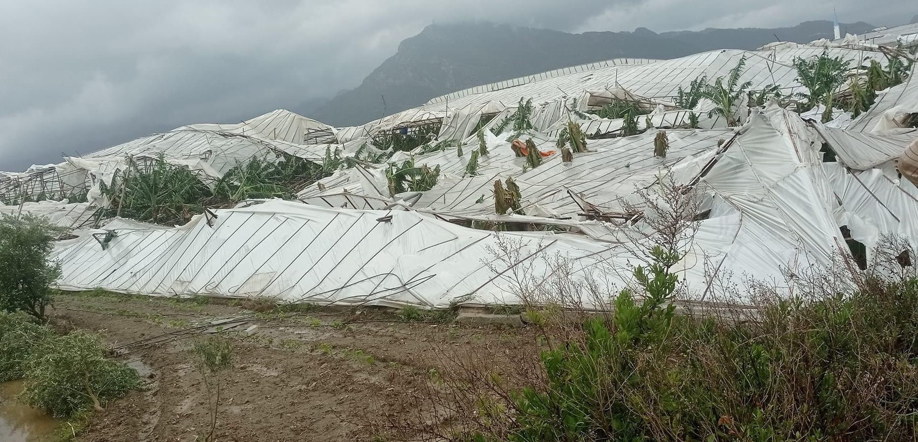Fırtına ile birlikte ortaya çıkan hortum, ilçeye bağlı Sultan Alaaddin, Akarca ve Ören mahallelerinde seraları parçaladı, çatıları uçurdu.