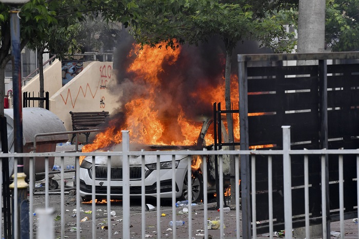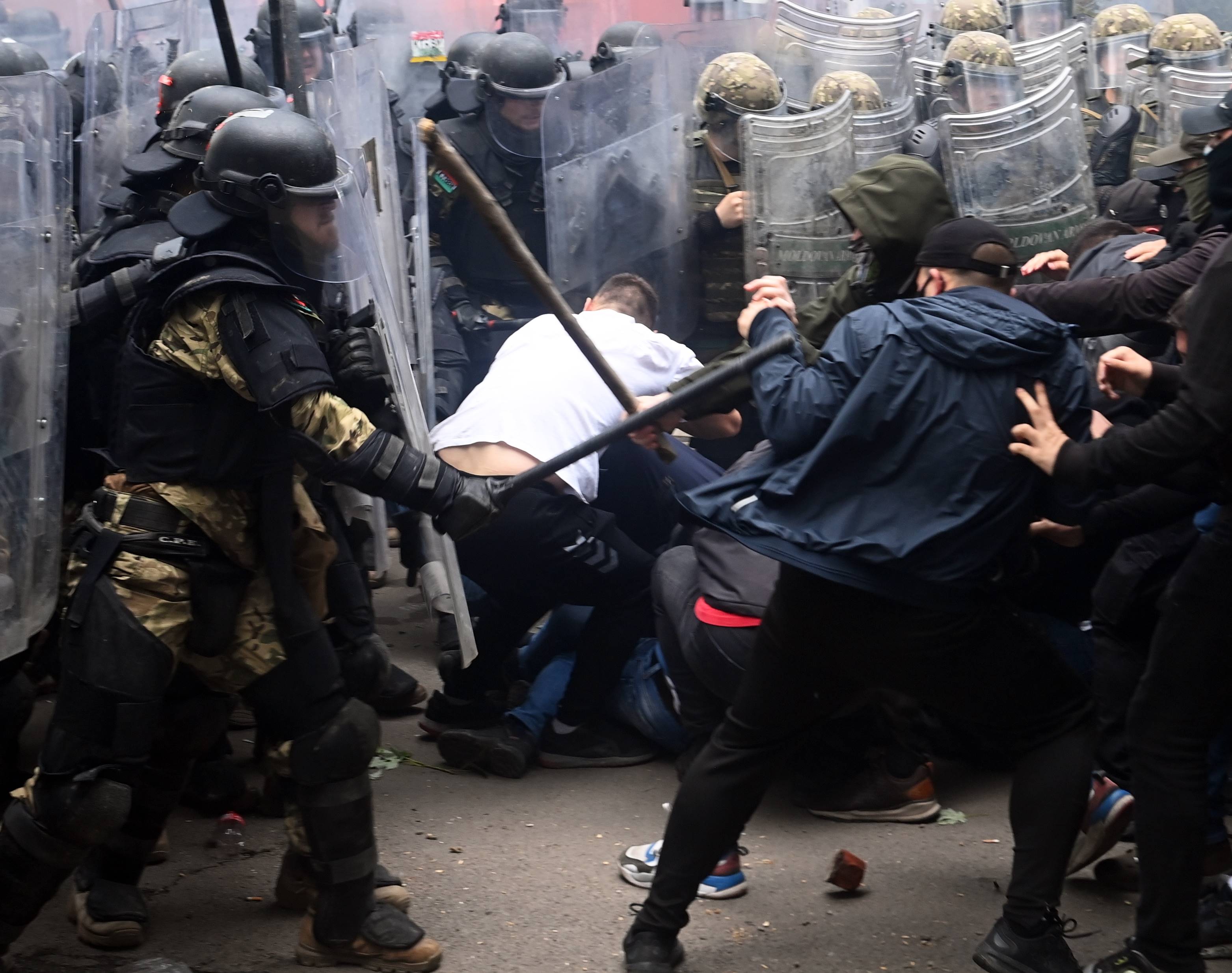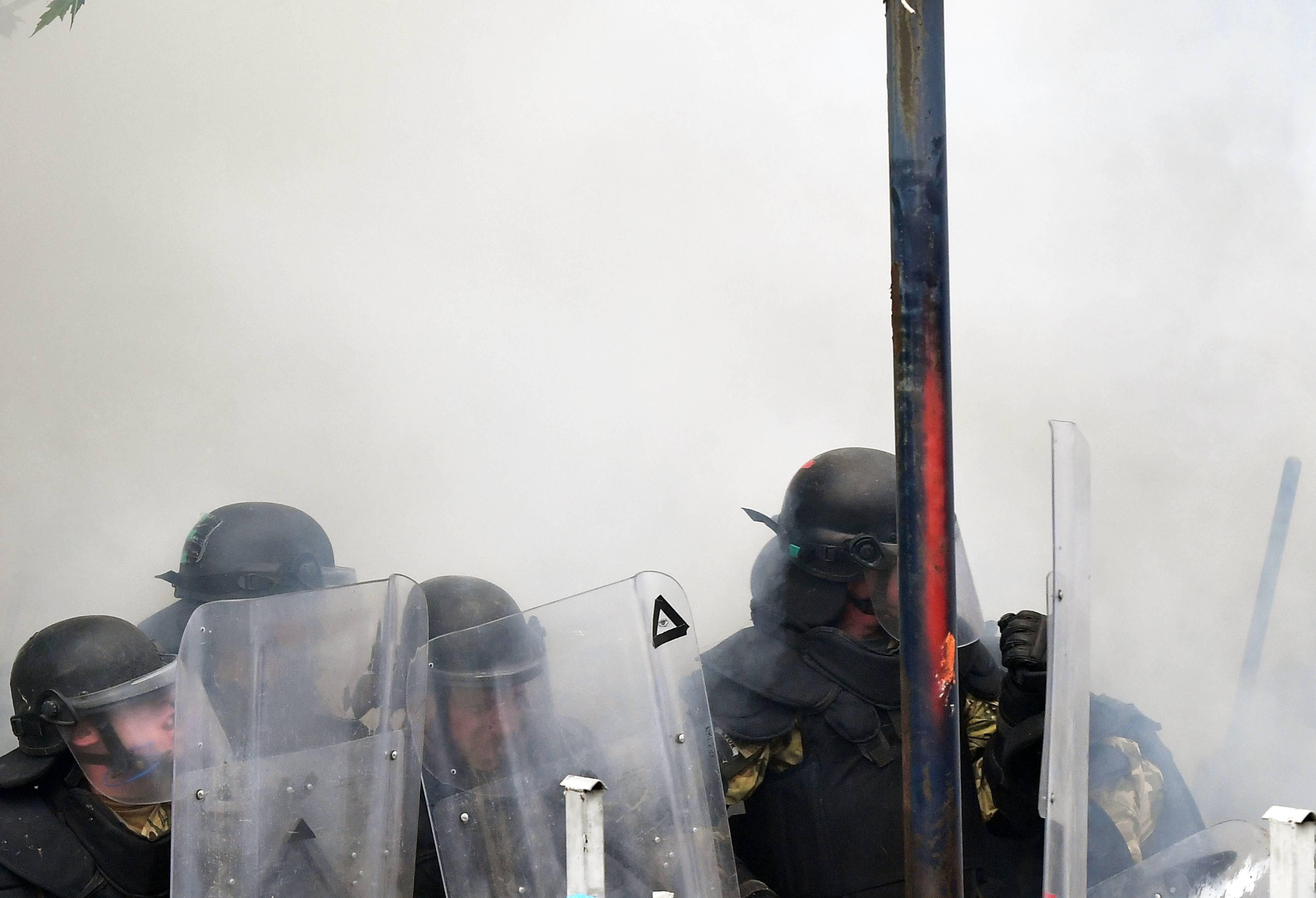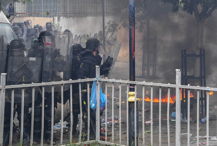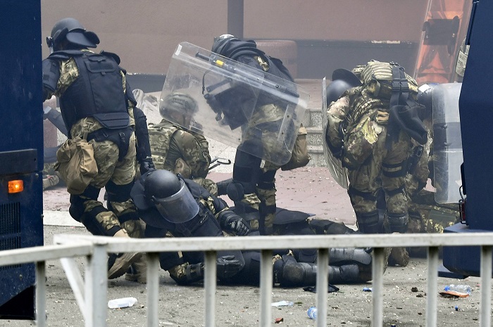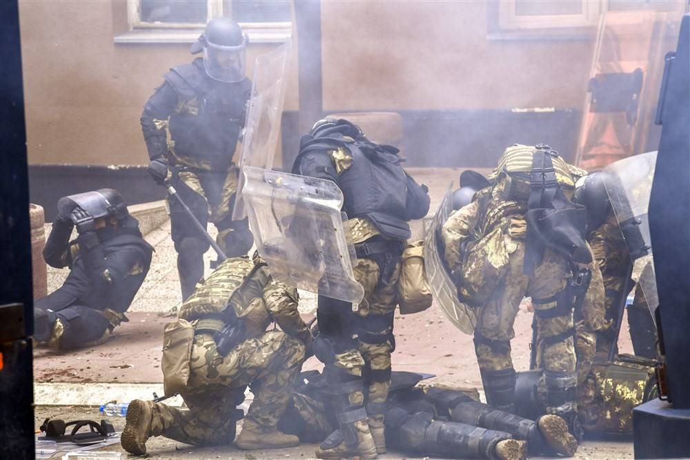 KFOR, belediye binası önündeki kalabalığı göz yaşartıcı gaz kullanarak dağıtmaya çalıştı, protestocular KFOR güçlerine sert cisimler atarak karşılık verdi.