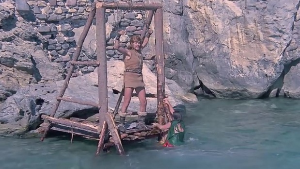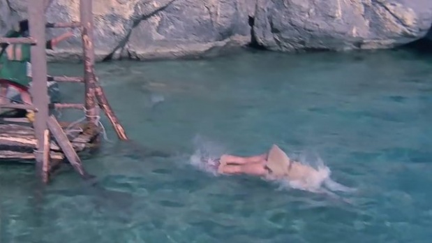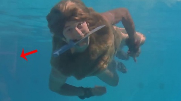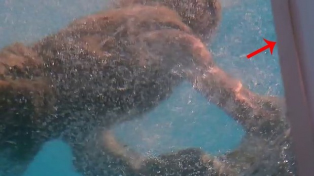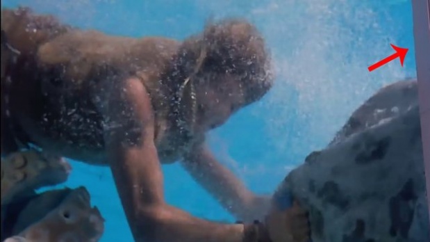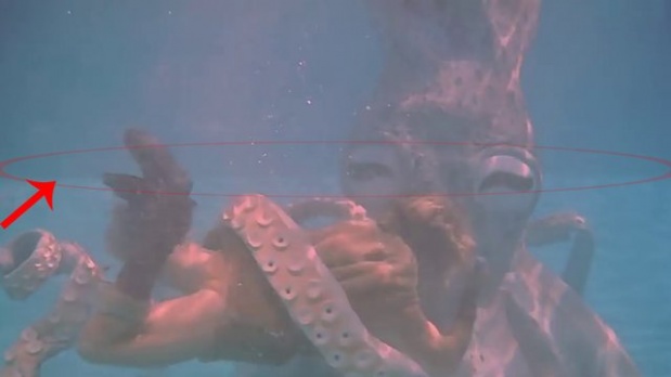 Ahtapot ile boğuşma sahnesinde arka planda çekimin yapıldığı havuzun duvarları görünüyor.