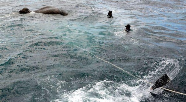Halatlarla bağlanan vahşi fil, kontrollü bir şekilde kıyıya doğru yönlendirdi.