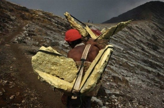 Bu aktif yanardağ ağzına varillerle kanallar döşenip erimiş sülfürler bir yerde toplanıyor ve oradan alınan sülfürler soğutulup kırılarak bambu sepetlere doldurulup köye taşınıyor.