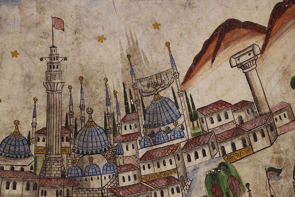 Üç tarihi şehirden yerlerin resmedildiği eserde Galata ve Bayezid kuleleri arası, Haliç ile Galata köprüleri, Sultanahmet, Ayasofya, Süleymaniye camileri ve Çemberlitaş görülüyor.