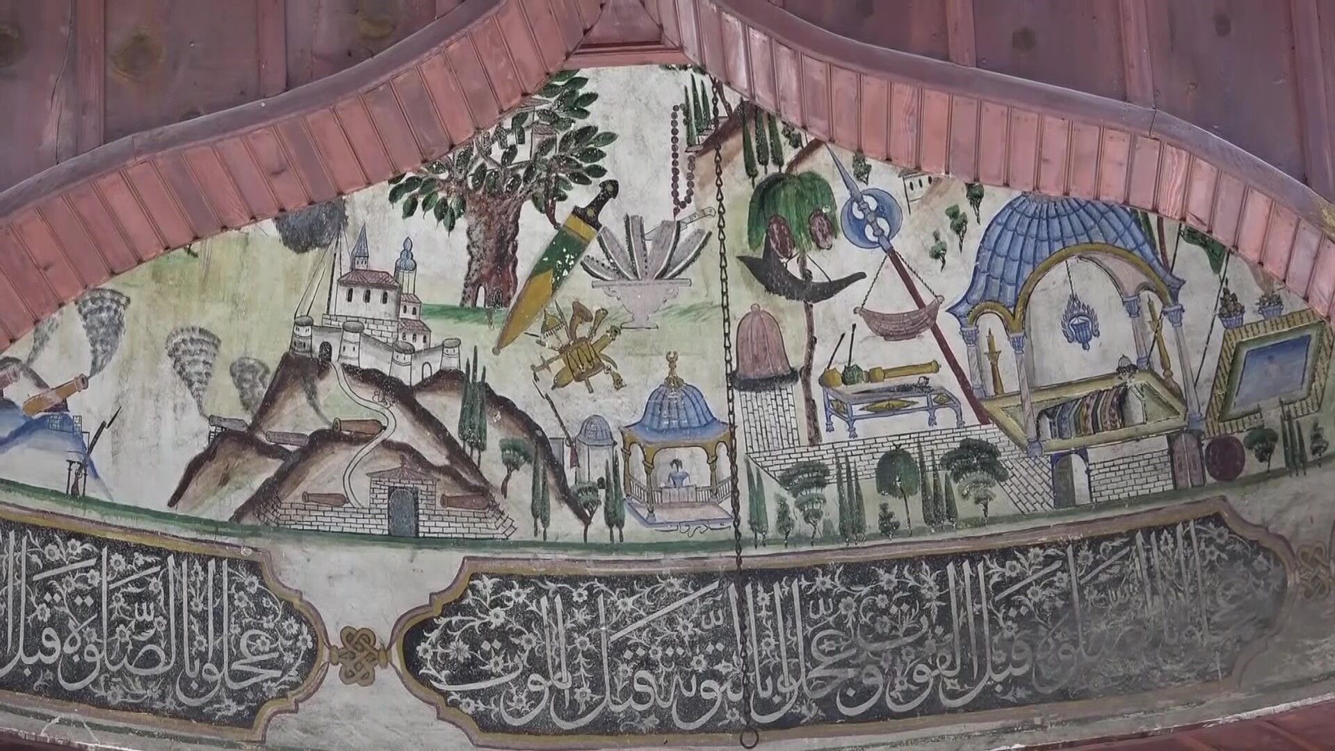 360 yıllık Kara Mustafa Paşa Camii'nin avlusundaki ahşap şadırvanın külah bölümüne 1865 yılında nakkaş Zileli Emin tarafından işlenen eser, geç dönem Osmanlı resim sanatının seçkin örnekleri arasında gösteriliyor.