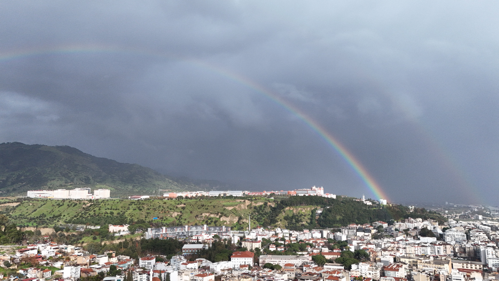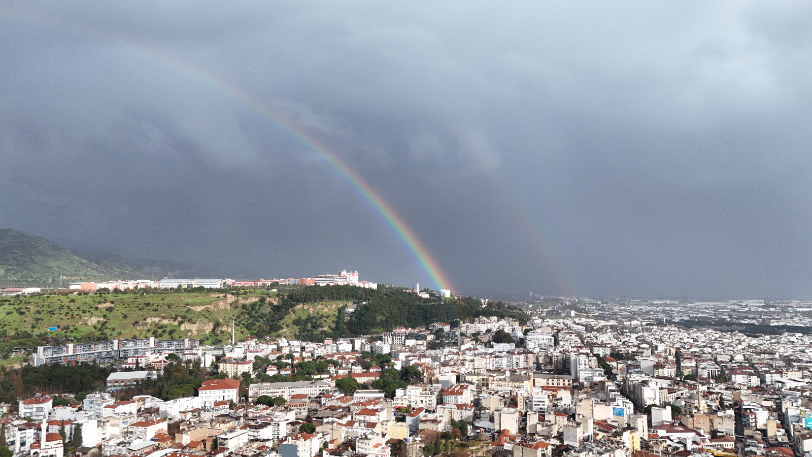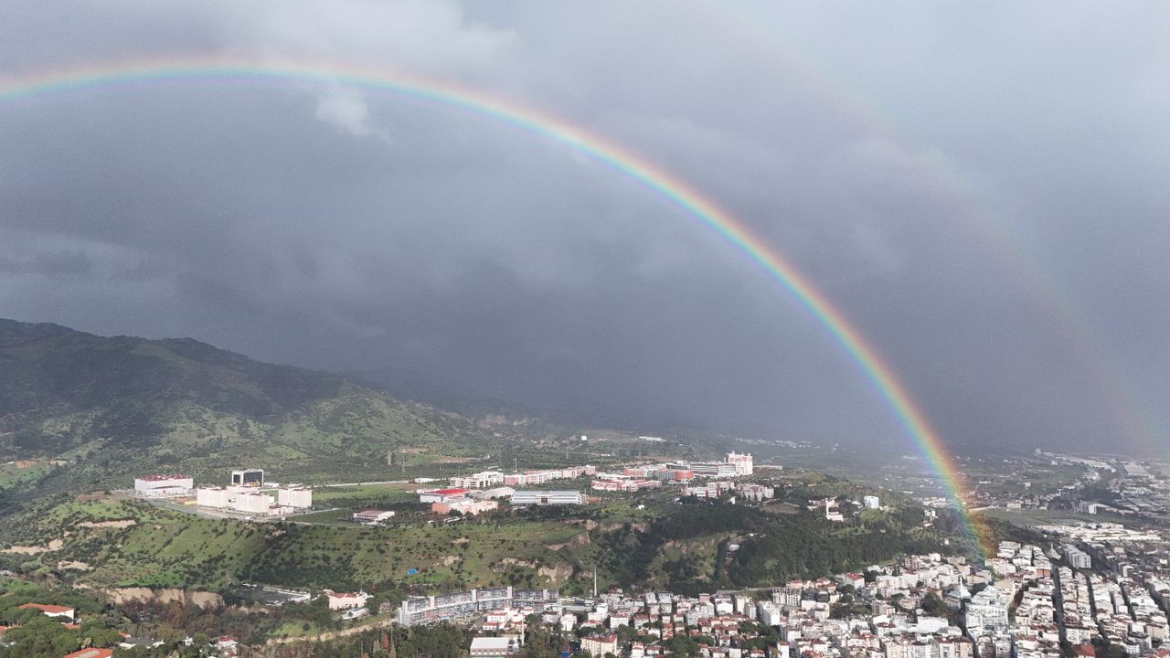 Gökkuşağının bir ucunun Aydın şehir merkezine, diğer ucunun ise kadim Tralleis Antik Kenti’ne uzanması, tarihin izleri ile doğanın güzelliğini aynı karede buluşturdu. Şehri bir kuşak gibi çevreleyen bu renk cümbüşü, izleyenleri büyülerken bir süre sonra gökyüzünden süzülerek gözden kayboldu.