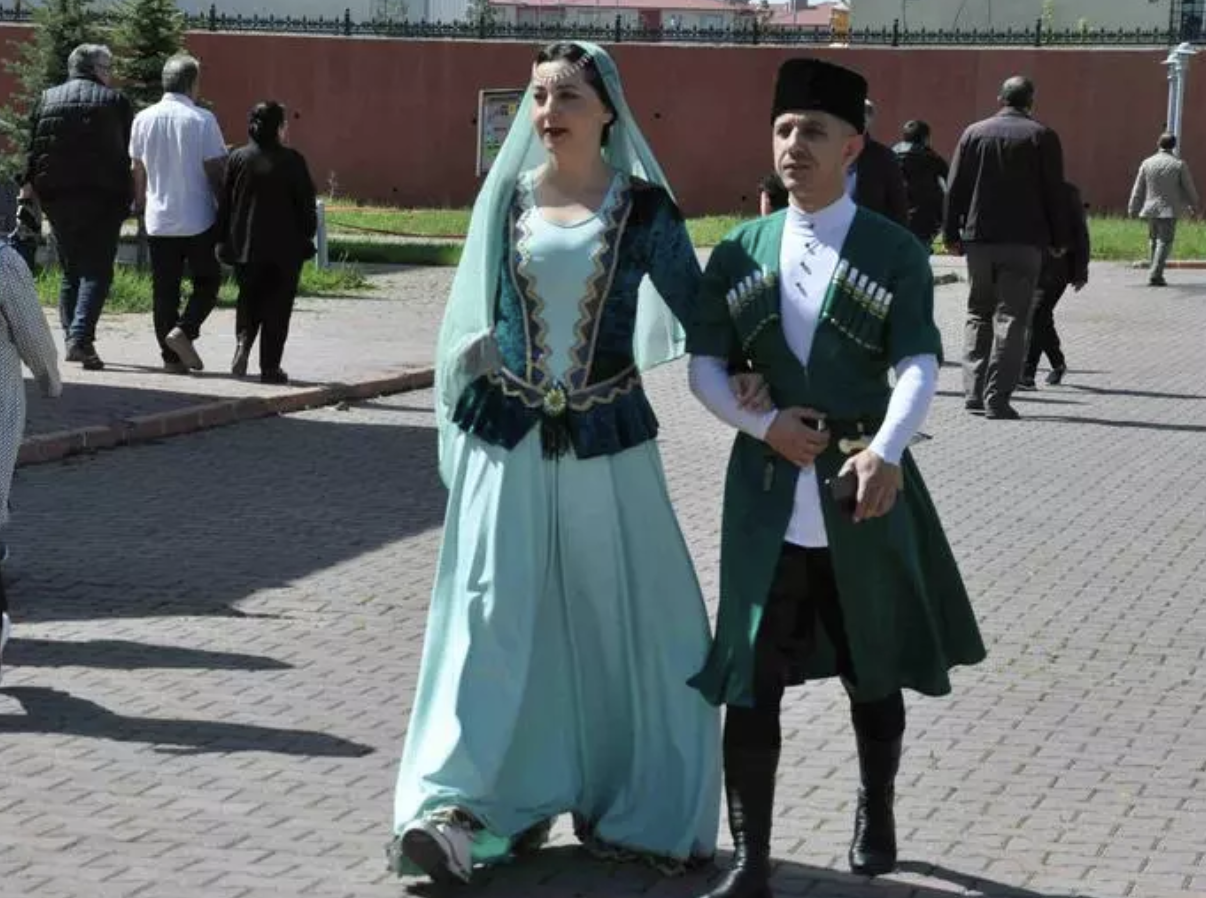 Kars’ta Kafkas kıyafetiyle Haydar Aliyev Lisesi’ne oy kullanan Şeyda ve Cem Kızılkaya çifti, kıyafetleriyle ilgi odağı oldu.