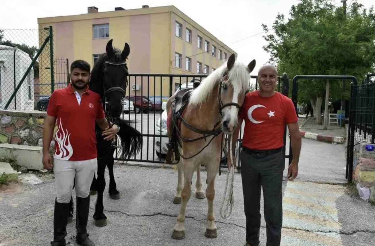 İzmir'in Bornova ilçesinde at eğitmeni Faruk Ceren ile arkadaşı Cihan Saha, at üstünde oy kullanmaya geldi.