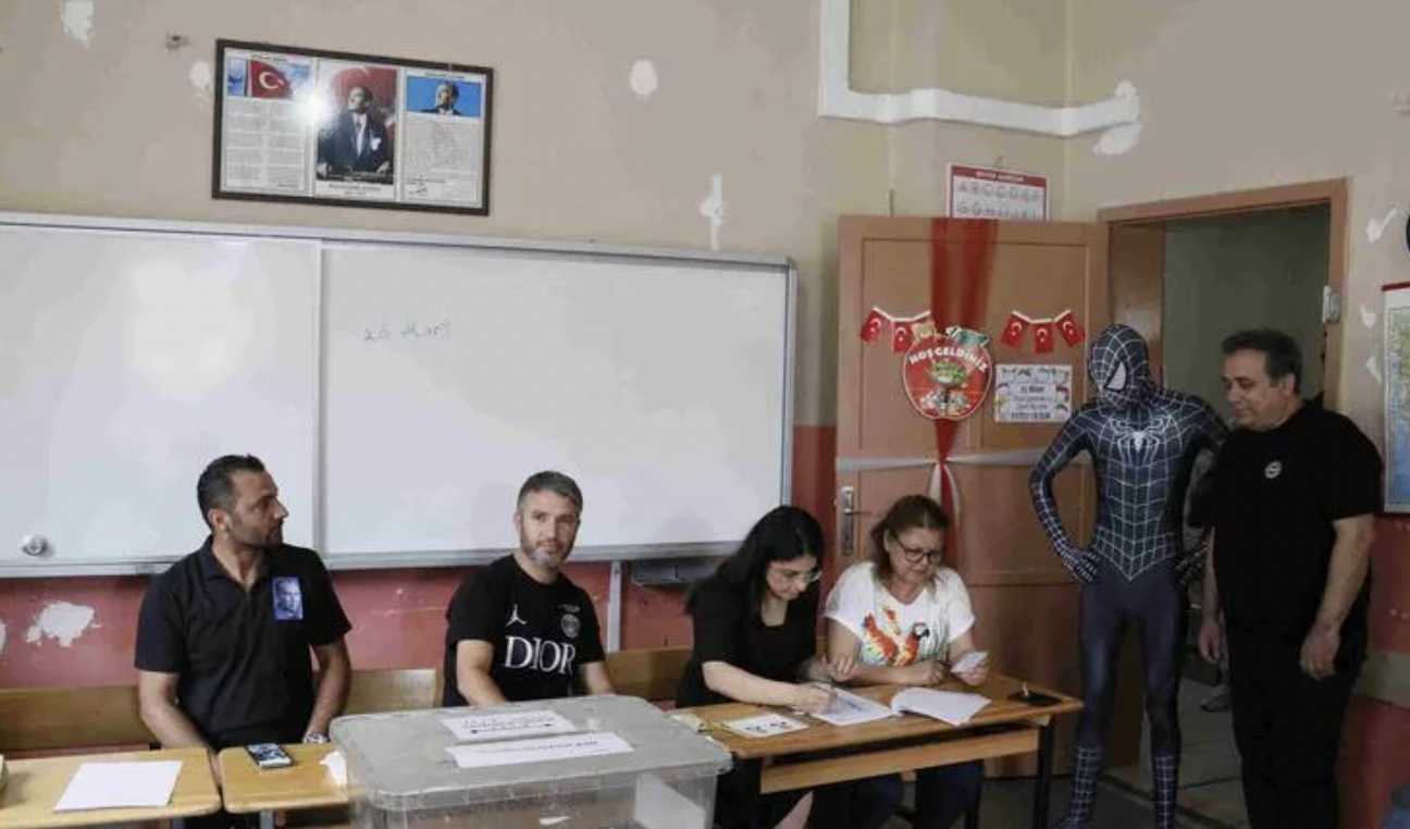 Adana’da 26 yaşındaki Can Şaşkın, Örümcek Adam kostümü giyerek oy kullanmaya geldi. Örümcek adamı gören vatandaşlar yoğun ilgi gösterdi.