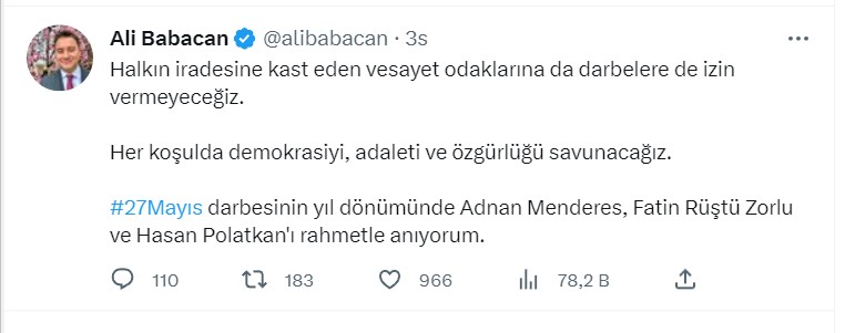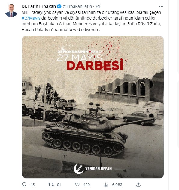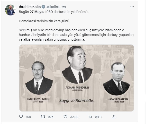 "Bugün 27 Mayıs 1960 darbesinin yıldönümü.