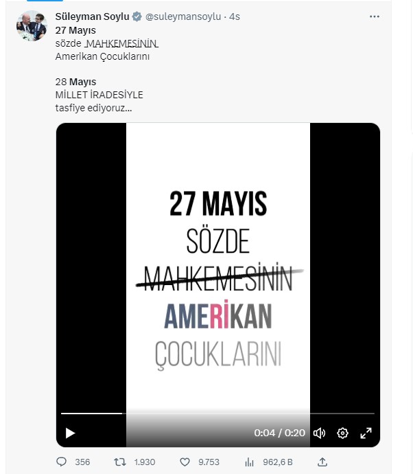 "Başta #27Mayıs 1980'de şehit edilen Gümrük ve Tekel Bakanımız #GünSazak bey olmak üzere; ebediyete intikal etmiş tüm ülküdaşlarımızla birlikte; bu cennet vatan için gözünü kırpmadan can veren tüm şehitlerimizi rahmet, şükran ve minnetle yad ediyorum..."