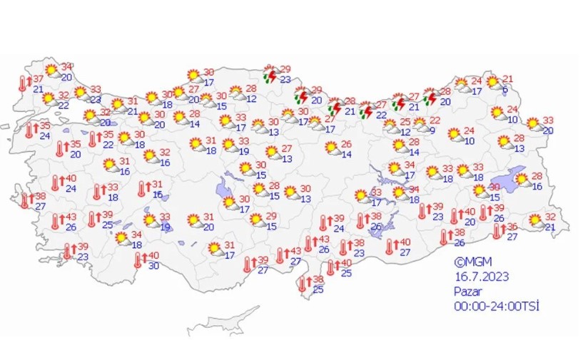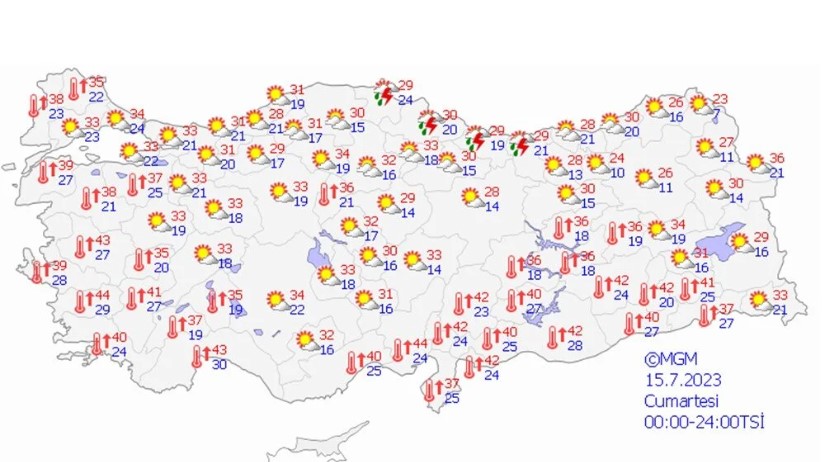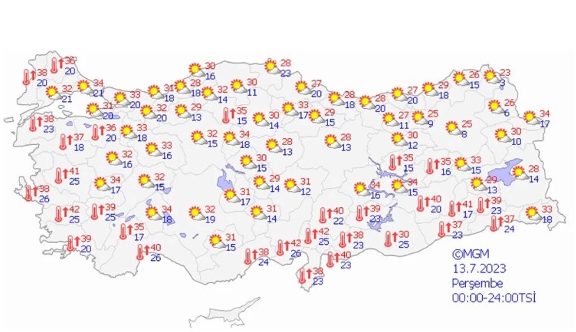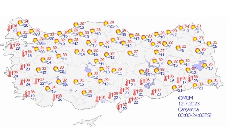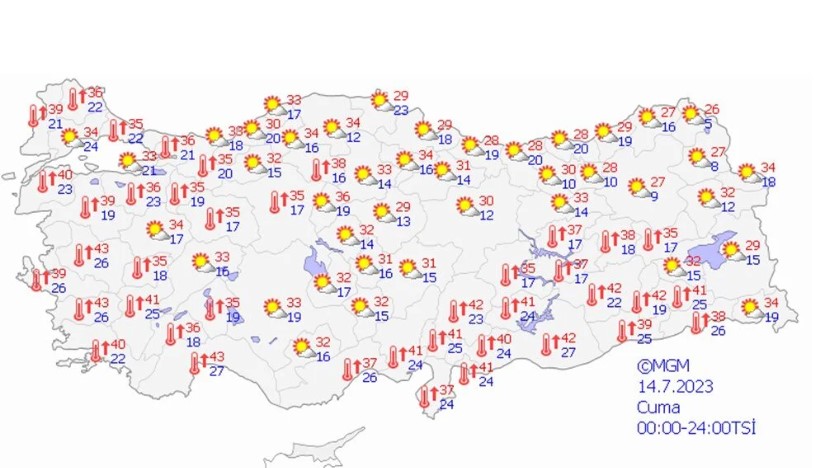 Perşembe Cuma günleri İstanbul'da sıcaklık 35'lere doğru çıkacak. Çanakkale, Balıkesir tarafında 38-39 dereceleri göreceğiz. Ege'de özellikle iç Ege'de sıcaklıklar 40 dereceyi zorlayacak. Hatta 40 dereceyi geçecektir. Sahillerde hissedilen sıcaklık 38 dereceyi bulacak. Akdeniz'de Adana ve Antalya arası 40 dereceye ulaşacak. İç Anadolu'da Ankara'da Kayseri'de 38 dereceye ulaşacak.