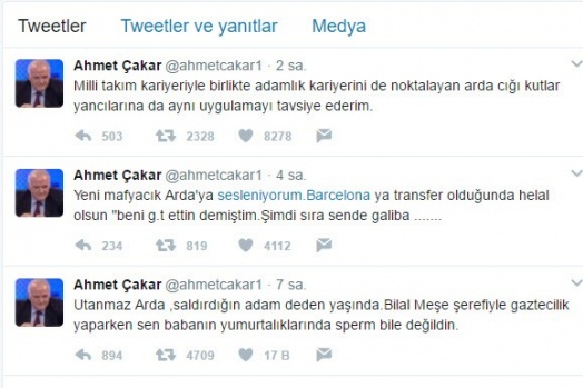 Makedonya'dan dönüş uçağında Milliyet yazarı Bilal Meşe'ye fiziki saldırıda bulunan ve ağır hakaretlerde yağdıran Arda Turan'a sosyal medyada tepki yağdı.. Makedonya'da duayen gazeteci Bilal Meşe'ye fiziki ve sözlü saldırıda bulunan Arda Turan'a tepki çığ gibi büyüyor.