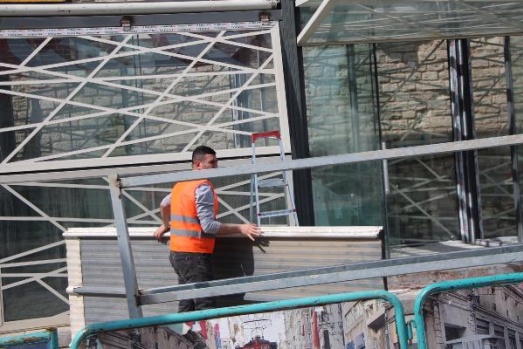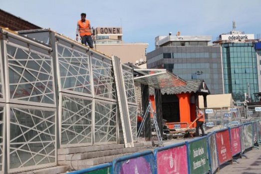 İşçiler çalışmalara çiçek satış kabinlerinin çatı kısmından başladı.