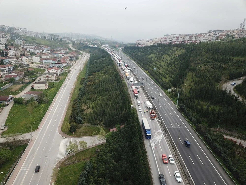 Kaza nedeniyle 30 dakika trafiğe kapalı kalan yolda, uzun araç kuyrukları oluştu.