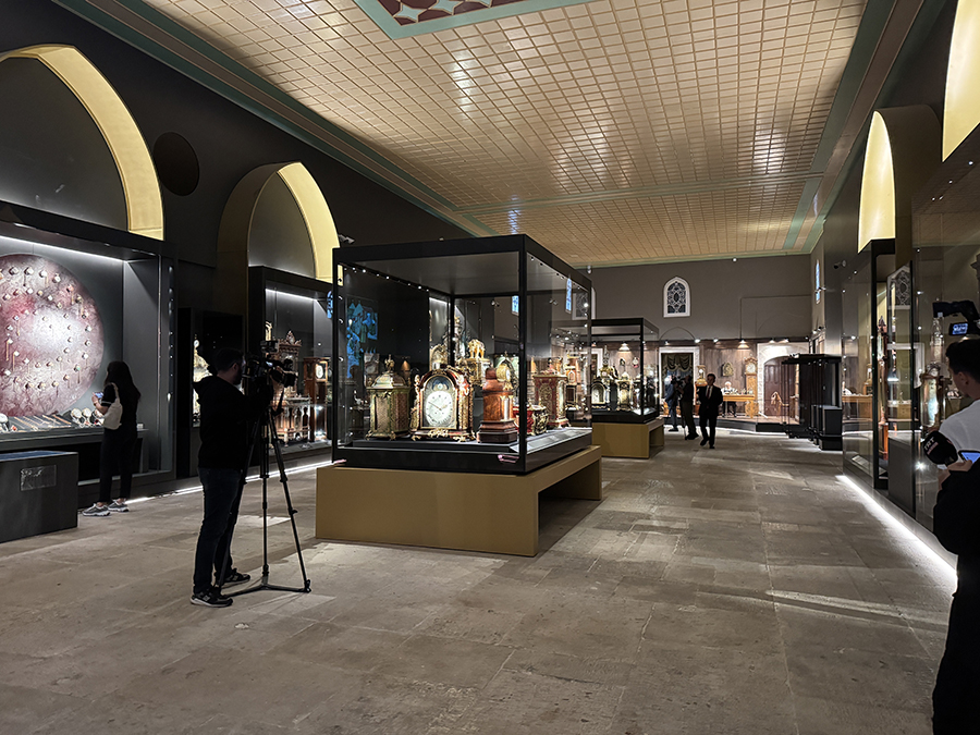 Milli Saraylar'ın envanterinde Topkapı Sarayı'nın saat koleksiyonunun dünyaca meşhur bir koleksiyon olduğunu söyleyen Milli Saraylar Başkanı Dr. Yasin Yıldız, "Bu müze gerçekten önemli bir ilk niteliğini taşıyor. Çünkü Milli Saraylar'ın envanterinde Topkapı Sarayı'nın saat koleksiyonu zaten dünyaca meşhur bir koleksiyon. 380 adet tarihi saatten oluşan bir koleksiyon bu. Bu koleksiyon aslında geçmiş yıllarda kısıtlı ölçülerde küçük bir kısmı sergilenmişti. Ancak ilk defa bir bütün olarak bir sarayda müze oluşturacak kadar ilk defa ziyaretçiyle buluşuyor. Bu yönüyle çok önemli. Restorasyon çalışmaları kapsamında 3 yıllık bir süreç var. Hasarlar bölgesinde bu nitelikli binaların 16. yüzyıldan kalma yapılar restorasyonu. Ardından koleksiyonda yer alan eserlerin tek tek taşınabilir olarak restorasyonları bu 3 yıllık süre içinde tamamlandı. Yaklaşık 15. yüzyıldan 20. yüzyıla kadar çok önemli bir seçkiye sahibiz. 380 saatten oluşan koleksiyonumuzun 300 saatlik kısmını burada bir bütün halinde sergiliyoruz. Bunların 200'den fazlası da depolardan ilk defa çıktı" ifadelerini kullandı.