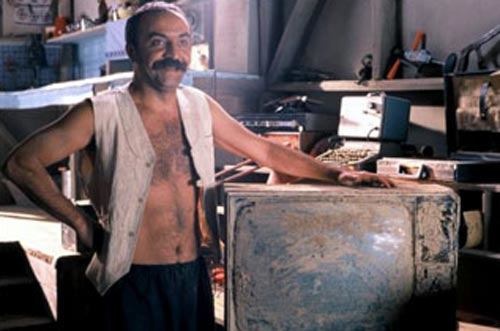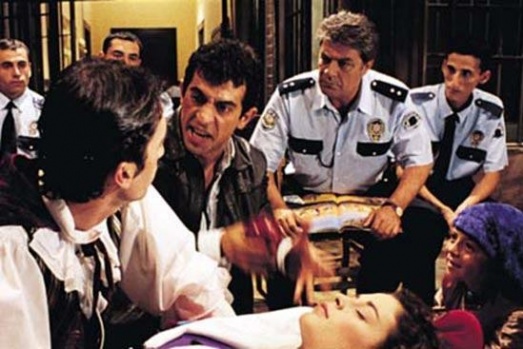 Filmde Ahmet ile Mahmut Hıca vedalaşırken bir set çalışanı da kadraja giriyor.