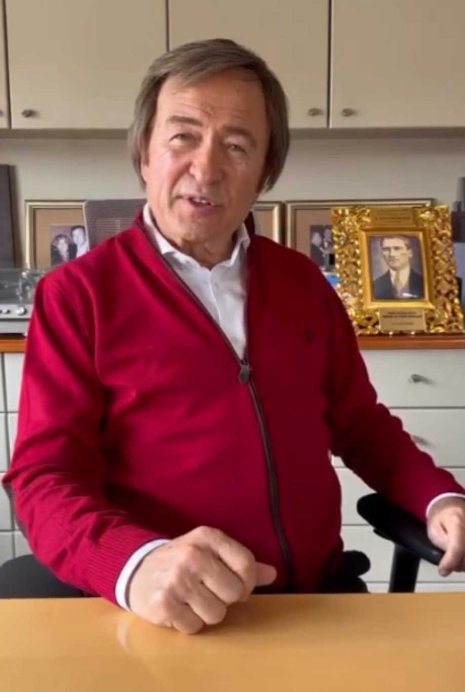 Kırmızı Beyaz kombini ile dikkat çeken Erol Evgin, 23 Nisan'ı kutlayan ünlüler arasındaydı. Evgin'in hemen arkasındaki Mustafa Kemal Atatürk fotoğrafları dikkat çekti.