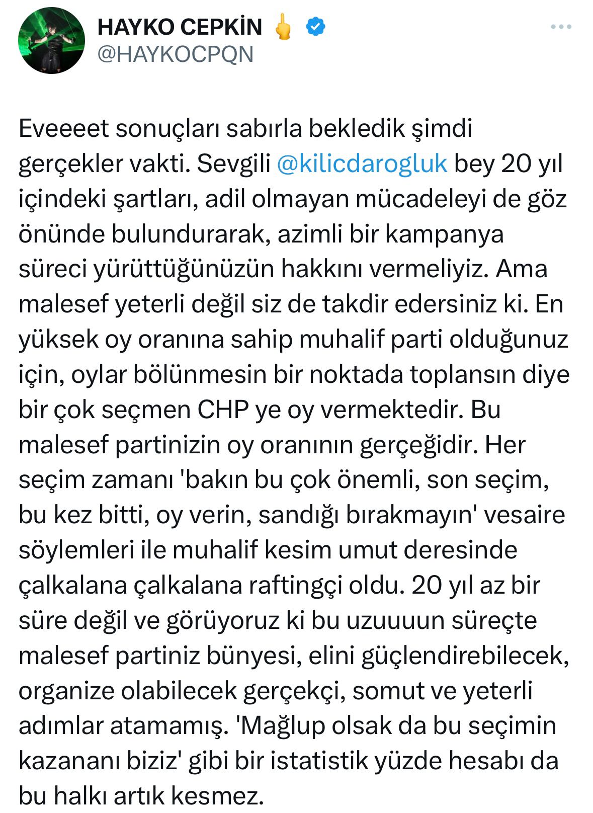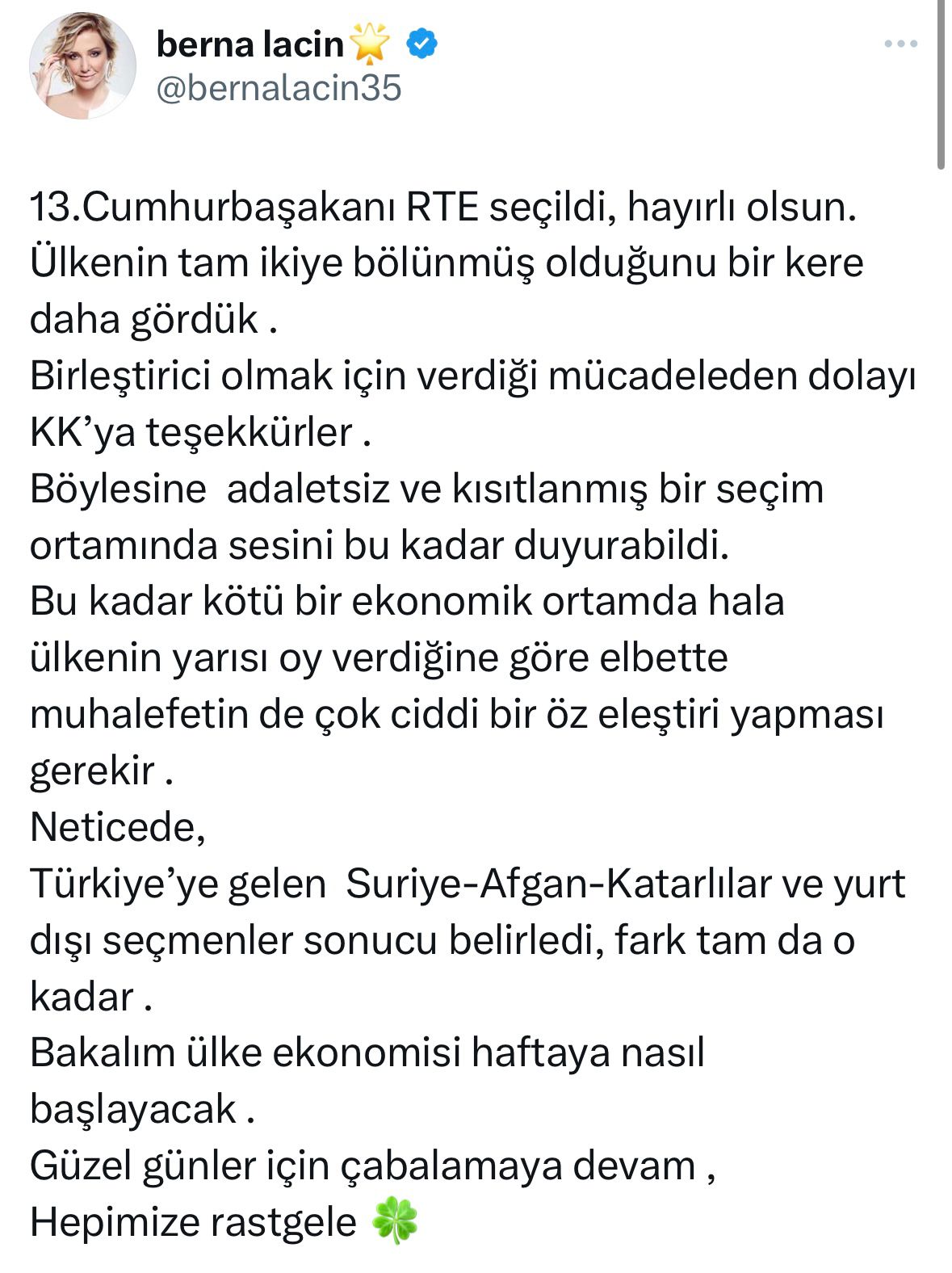 Cumhurbaşkanlığı seçiminin ikinci turundan zaferle ayrılan ismin Recep Tayyip Erdoğan olmasının ardından, ünlüler tarafından yapılan paylaşımlar sosyal medyanın gündemine oturdu. İşte ünlülerden seçim yorumları: