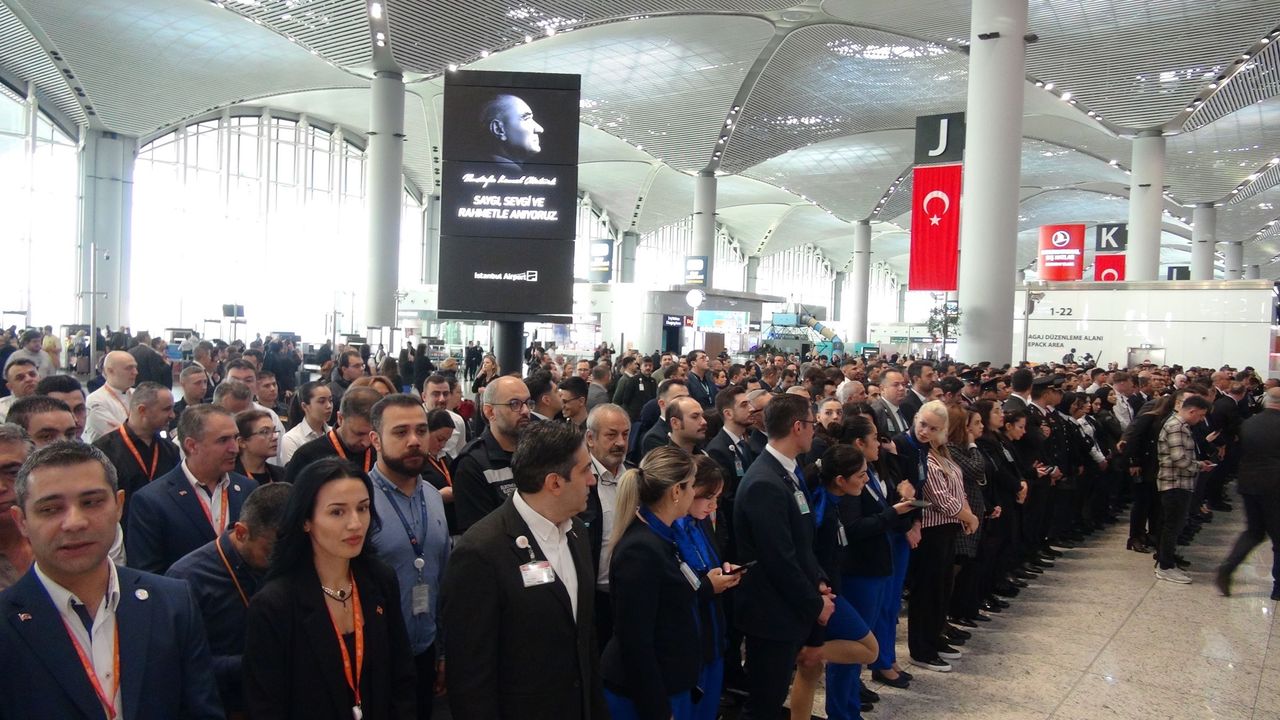 Türkiye Cumhuriyeti'nin kurucusu Mustafa Kemal Atatürk'ün ebediyete intikal edişinin 87'nci yıldönümünde İstanbul Havalimanı'nda töreni düzenlendi. Havalimanının Dış Hatlar Gidiş Terminali'ne Türk bayrağı ile Atatürk portresi asıldı. Tören öncesinde Türkçe ve İngilizce anonslar yapıldı. Çok sayıda havalimanı personeli ve yolcu törenin düzenlendiği alanda toplandı. Havalimanı çalışanları ve yolcular saatler 09.05'i gösterdiğinde sirenlerin çalmasıyla 2 dakikalık saygı duruşunda bulundu. Yabancı yolculardan bazıları da saygı duruşuna eşlik etti. İstiklal Marşı'nın okunmasının ardından tören sona erdi.