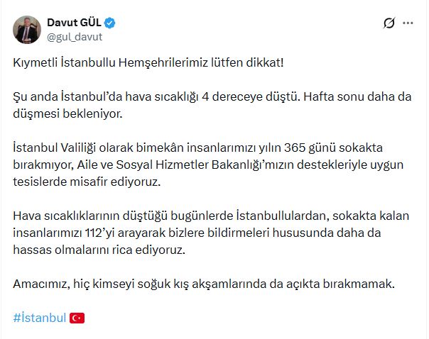 İSTANBUL Valisi Davut Gül, sanal medya hesabından yaptığı paylaşımda İstanbul'da hava sıcaklığının 4 dereceye düştüğünü belirterek, "İstanbul Valiliği olarak bimekan insanlarımızı yılın 365 günü sokakta bırakmıyor, Aile ve Sosyal Hizmetler Bakanlığı'mızın destekleriyle uygun tesislerde misafir ediyoruz. Hava sıcaklıklarının düştüğü bugünlerde İstanbullulardan, sokakta kalan insanlarımızı 112'yi arayarak bizlere bildirmeleri hususunda daha da hassas olmalarını rica ediyoruz. Amacımız, hiç kimseyi soğuk kış akşamlarında da açıkta bırakmamak." ifadelerini kullandı.