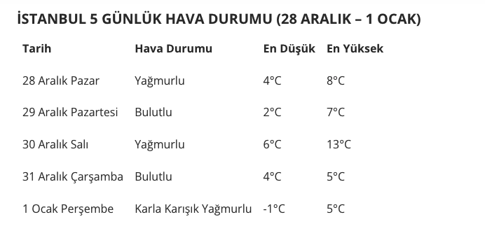 İstanbul için Meteoroloji Genel Müdürlüğü 5 günlük tahmini hava durumunu açıkladı. 28 Aralık Pazar günü (bugün) yağmur bekleniyor.