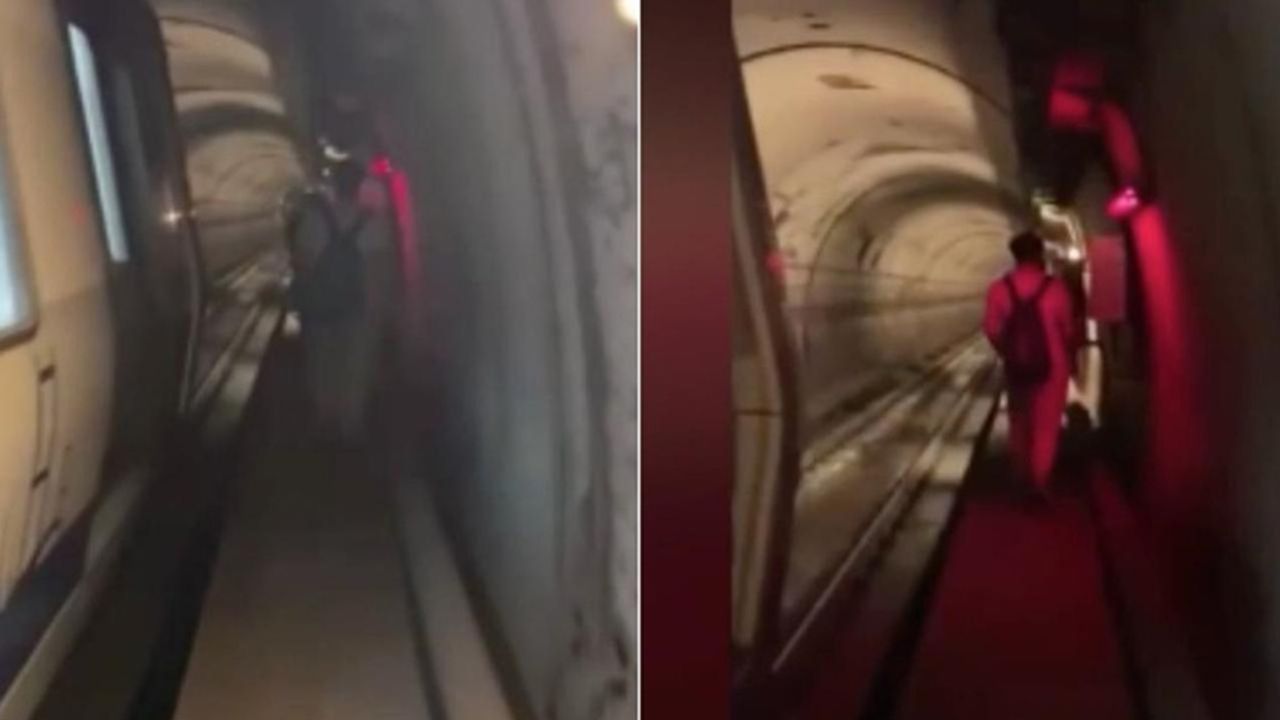 İstanbul'da Levent-Boğaziçi Üniversitesi Hisarüstü Metro Hattı'nda meydana gelen teknik arıza nedeniyle yolcular metrodan inerek en yakın durağa kadar raylarda yürüdü. O anlar cep telefonuyla keydedildi.