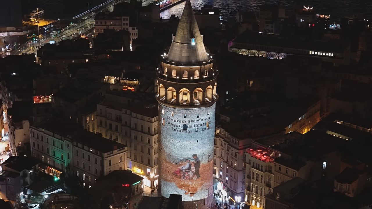Kahramanmaraş'ta 6 Şubat 2023'te saat 04.17'de meydana gelen 7.7 büyüklüğündeki depremin 3'üncü yıl dönümü nedeniyle Galata Kulesi'nde video gösterimi gerçekleştirildi. Türkiye Beyazay Derneği tarafından düzenlenen etkinlik dronla havadan görüntülendi.
