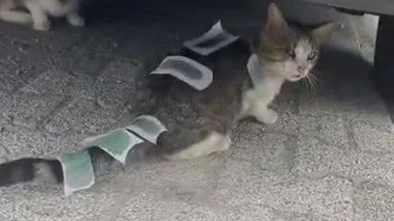 Kedinin kuyruğundan sırtına kadar farklı noktalara yapıştırılan ağda bantlarını gören vatandaşlar şaşkınlık yaşadı.