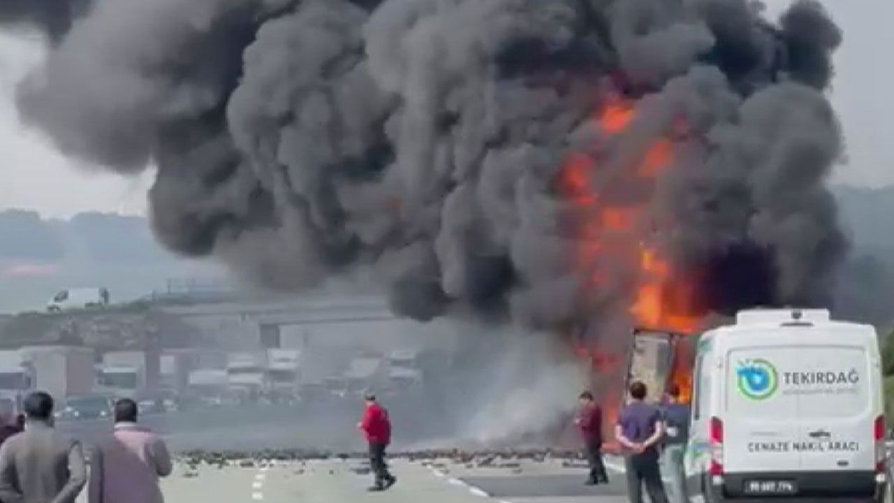 Kuzey Marmara Otoyolu Çatalca istikametinde seyir halindeki bir tırda henüz belirlenemeyen nedenle yangın çıktı. Olay yerine polis, itfaiye ve sağlık ekipleri sevk edildi. Ekiplerin müdahalesi sürüyor.