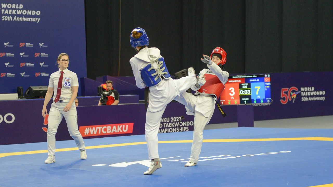 Milli tekvandocu Merve Dinçel, Azerbaycan’da gerçekleştirilen 26. Dünya Tekvando Şampiyonası'nda Kazakistanlı rakibi Botakoz Kapanova’yı 2-0'lık skorla yenilgiye uğratarak yarı finale yükseldi.
