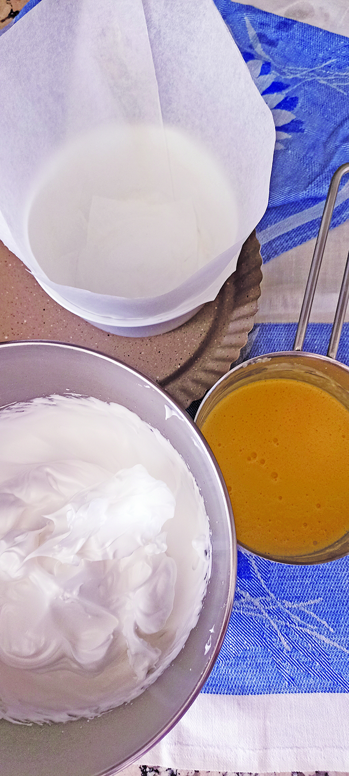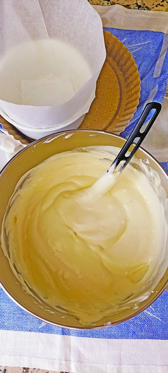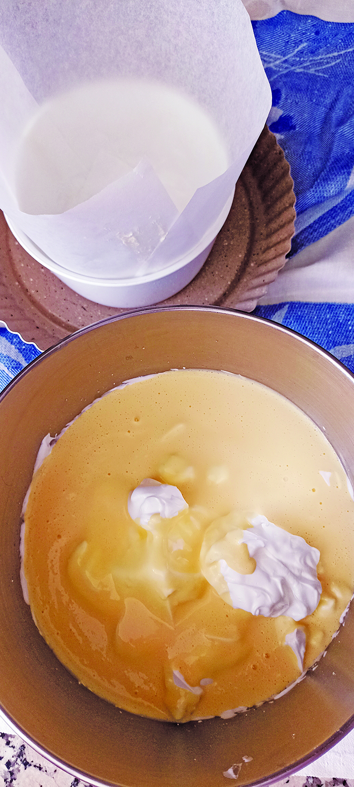 Peynir karışımına çırparak kar gibi beyaz hale getirdiğimiz yumurta akını yavaş yavaş ekleyelim. Pürüzsüz olana kadar bir spatula ile hafifçe karıştırın.
