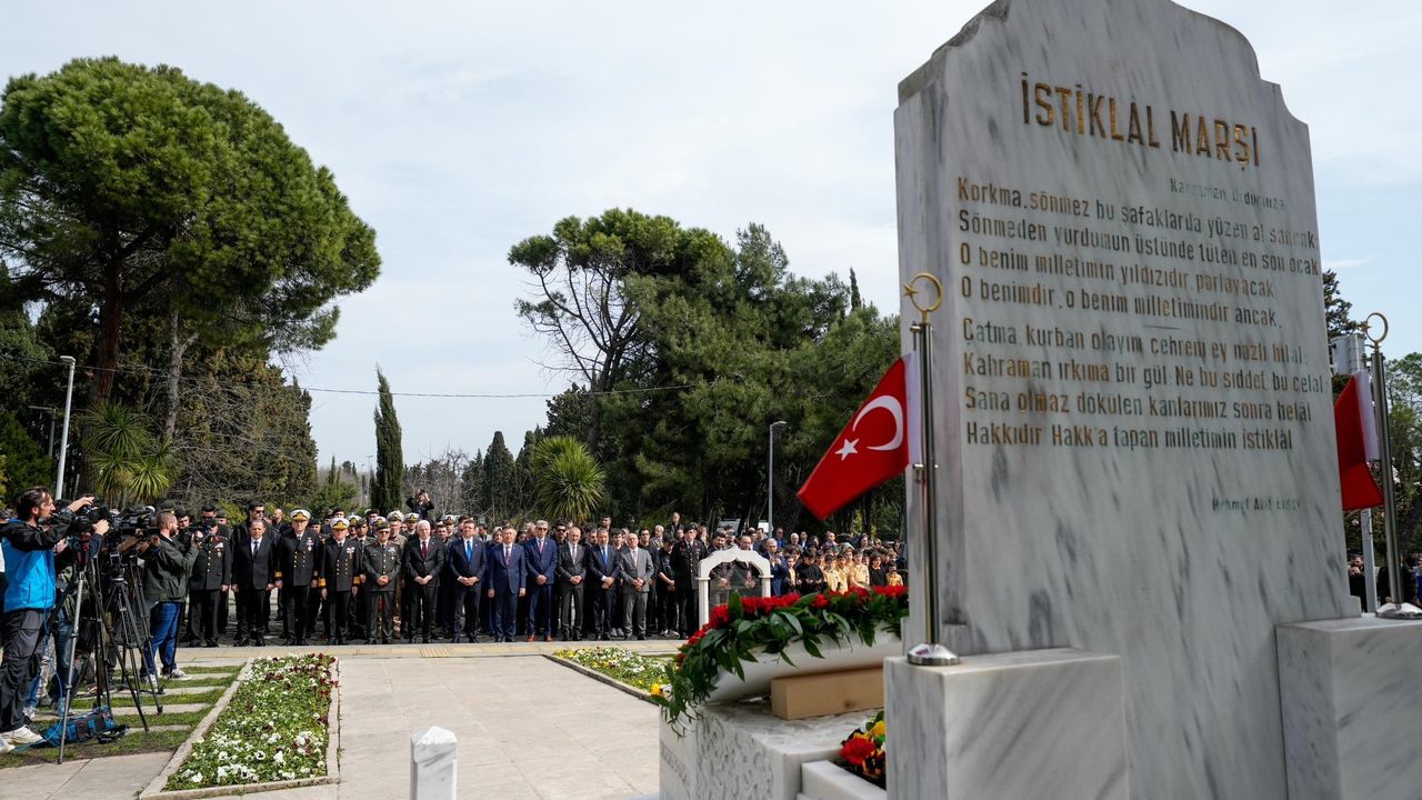 İstanbul Valiliği tarafından İstiklal Marşı’nın kabulünün 104’üncü yıl dönümü nedeniyle Milli Şair Mehmet Akif Ersoy’un Edirnekapı Mezarlığı’ndaki kabri başında bir anma töreni düzenlendi. Törene İstanbul Valisi Davut Gül, 1. Ordu Komutanı Orgeneral Metin Tokel, İl Emniyet Müdürü Selami Yıldız, İl Jandarma Komutanı Tümgeneral Yusuf Kenan Topcu, Sahil Güvenlik ve Marmara Boğazlar Bölge Komutanı Tuğamiral Serkan Tezel, İstanbul Büyükşehir Belediye Başkanı Ekrem İmamoğlu, Eyüpsultan Kaymakamı Arslan Yurt ve öğrenciler katıldı. Kur'an-ı Kerim tilavetinin ardından, İstanbul Müftüsü Safi Arpaguş tarafından başta Mehmet Akif Ersoy olmak üzere İstiklal mücadelesinin tüm kahramanları ve şehitler için dua edildi. Tören İstanbul Valisi Davut Gül ile protokol üyeleri, Ersoy'un kabrine karanfil bırakmasının ardından sona erdi.