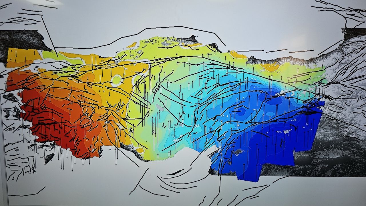 Türkiye'nin doğusunun kuzeye, batısının ise güneye hareket ettiğini belirten Kutoğlu, "Uzun yıllardır uydu radar verisiyle Türkiye'nin yer kabuğu hareketlerini inceliyoruz. Bu yer kabuğu hareketlerini daha derin bir analize tabi tuttuğumuzda, Ankara'nın doğusunda kalan kısmının kuzeye doğru hareket ettiğini, batısında kalan kısmının da güneye doğru hareket etmiş olduğunu tespit ettik. Tabii bunun neticesinde de Antalya'dan yukarıya doğru, Karadeniz Ereğli'ye doğru bir beyazla görmüş olduğumuz bir sıfır hattının olduğunu tespit ettik. Bu sıfır hattının doğusu yukarıya, batısı da aşağıya doğru hareket ettiği için sıfır hattı etrafında bir gerilim bölgesi meydana geliyor. Buna biz Orta Anadolu geçiş zonu adını verdik yaptığımız yayında. Bu Orta Anadolu geçiş zonu etrafında geçmiş yıllarda irili ufaklı depremler meydana gelmiş. Bu da bu hattın varlığını doğrular nitelikte. Bu durum bize şunu gösteriyor: Bu gerilim devam ettiği sürece, bu şekilde devam ettiği sürece, Türkiye'nin doğusu, Ankara'nın doğuda kalan kısmı yukarıya, batısında kalan kısmı aşağıya devam edecek ve bu milyonlarca yıllık bir süreç içerisinde bu miktar kilometrelere ulaşabilir ve neticesinde Anadolu'nun ortadan ikiye ayrılması söz konusu olabilir. İlerleyen zamanda, yüz binlerce yıl, milyonlarca yıldan bahsediyoruz, büyük gerilimler birikerek burada büyük boyutta depremlerin de meydana gelmesi söz konusu olabilir" ifadelerini kullandı.