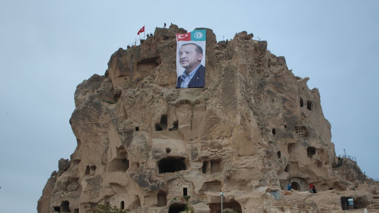 Nevşehir’in merkeze bağlı Uçhisar Kasabasındaki dünyanın en büyüğü olan doğal gökdelene, Cumhurbaşkanı Recep Tayyip Erdoğan'ın posteri asıldı.