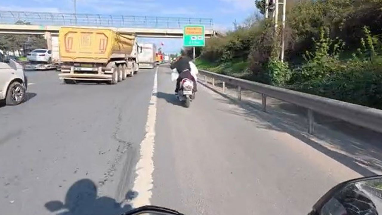 Ataşehir TEM Otoyolu'nda seyir halindeki motosiklet sürücüsü, arkasında oturan kadının saçını çekti. Motosikletteki kadın kavga sırasında dengesini kaybetti. Darbedilen kadının motosikletten düşmekten ve kamyonun altında kalmaktan kurtulduğu anlar başka bir motosikletlinin kask kamerasına yansıdı.
