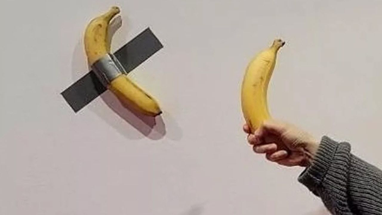 Duvara yapıştırılmış bir muzdan oluşan "Komedi" adlı sanat eseri de serginin bir parçası.