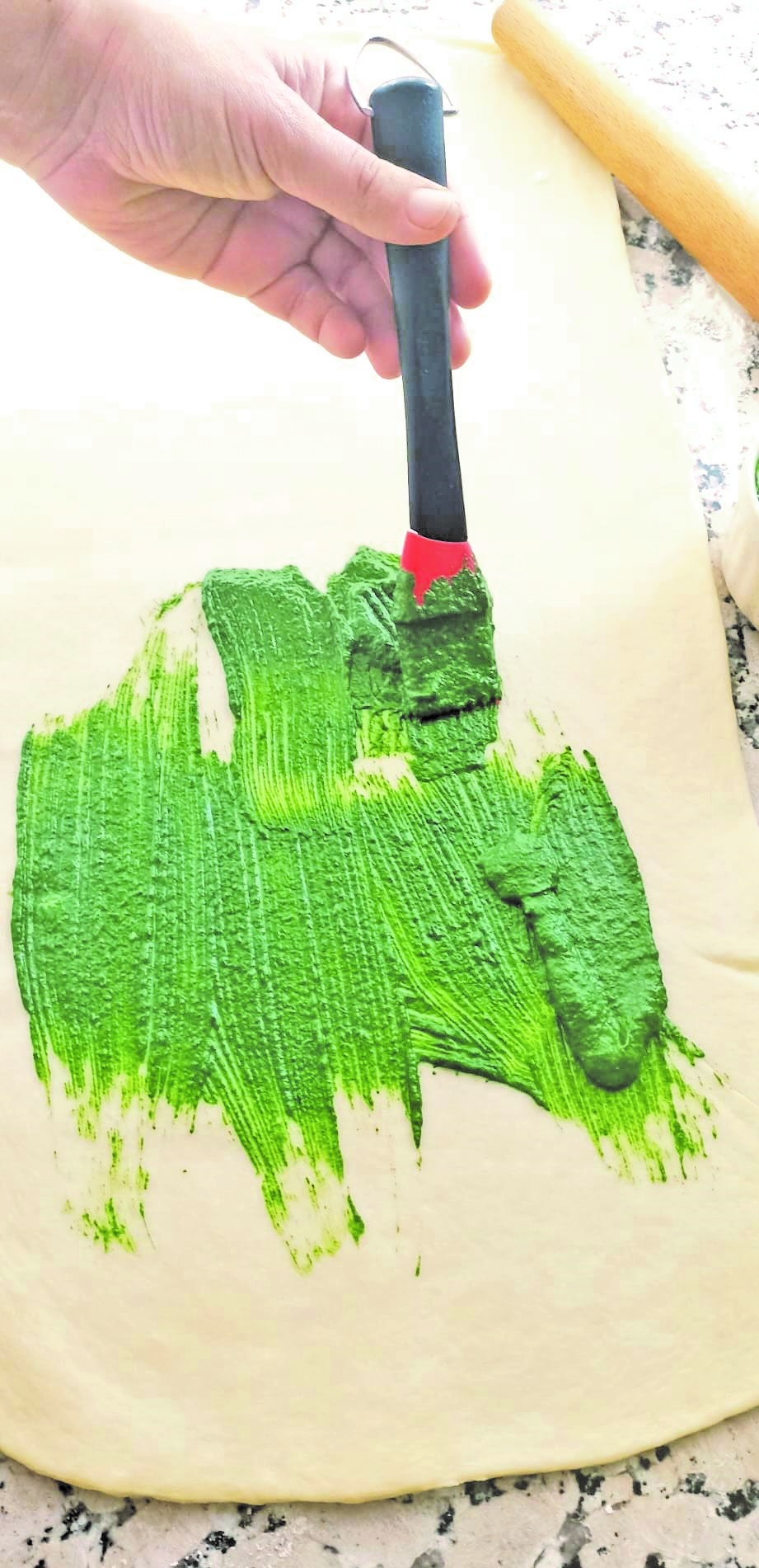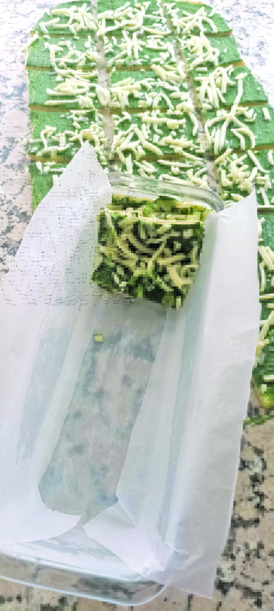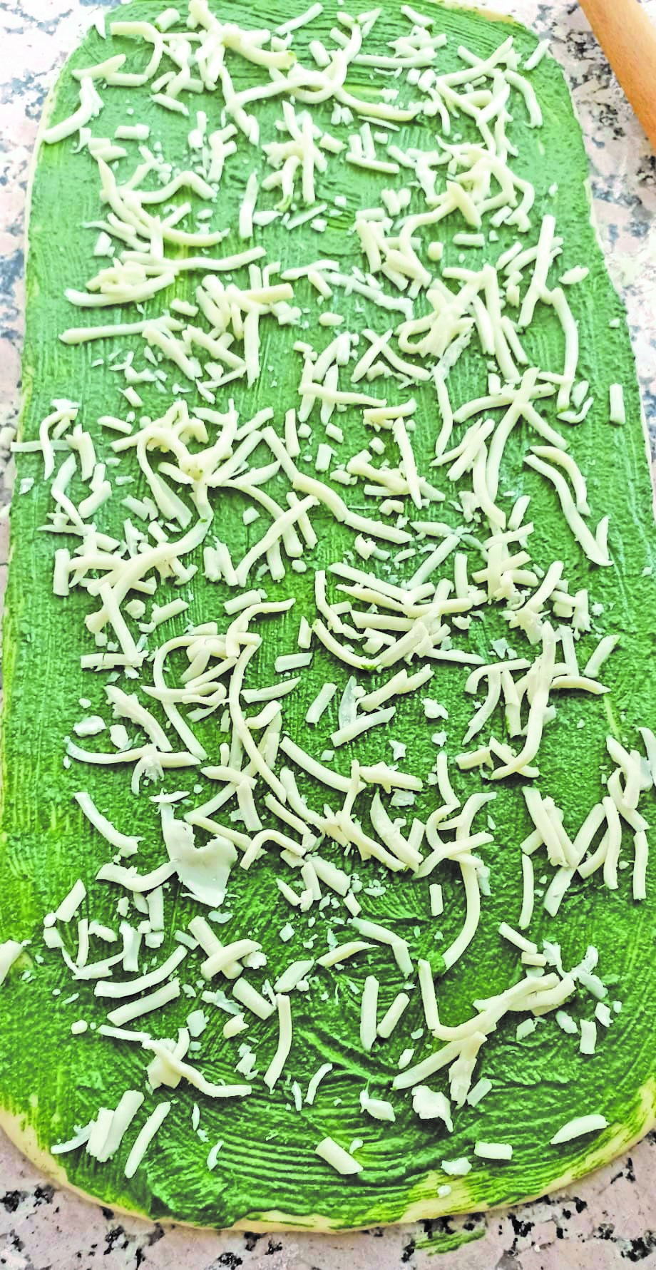 Üzerine ıspanaklı karışımı sürün ve peynir serpin. Daha sonra pizza kesici ile kare kare kesin.
