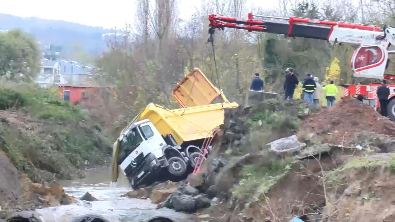 SARIYER Uskumruköy'de sağanak yağışın ardından yol çöktü. Çökme sırasında bir pikap ve kamyon dereye düştü. İhbar üzerine olay yerine jandarma, itfaiye ve sağlık ekipleri sevk edildi. Olayın yaşandığı noktaya bir kepçe ve vinç getirildi. Kepçe dereye düşen hafriyat kamyonunun bulunduğu alana yakın bir noktada çalışma başlattı. Dereye düşerek yan dönen kamyon, vinç yardımıyla düz hale getirildi. Kamyon vinç yardımıyla düştüğü dereden çıkarıldı. Dereye düşerek sürüklendiği belirtilen pikap için de ekiplerin çalışma yapacağı öğrenildi.