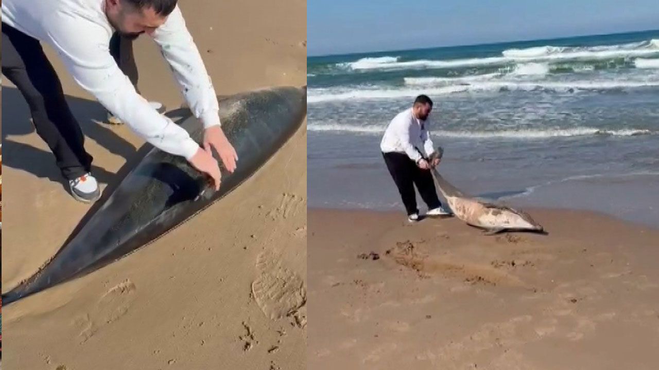 Dün Şile Sofular Sahili'nde yürüyüş yapan Bekir Yalçın, kıyıya vurmuş haldeki bir yunusu fark etti. Yalçın, arkadaşıyla birlikte yunusu yeniden denize ulaştırmak için müdahalede bulundu ancak yunus balığı kurtarılamadı.