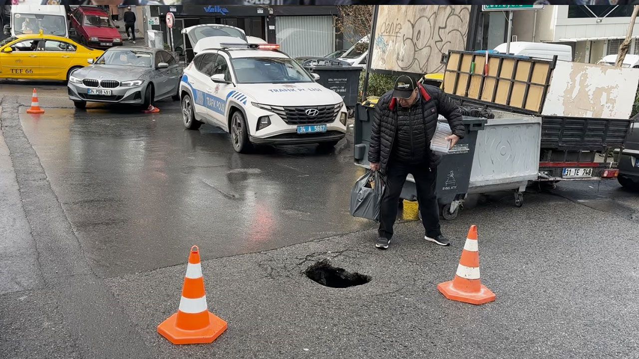 İstanbul'un Şişli ilçesinde etkili olan yağmur sonrası yolda çökme meydana geldi. Oluşan çukur nedeniyle sokak trafiğe kapatıldı.
