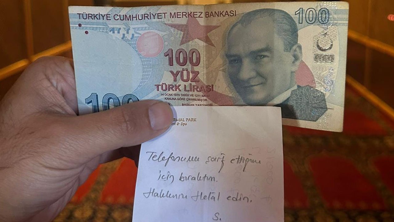 Bolu'nun Mudurnu ilçesinde camide namaz kılarken telefonunu şarj eden kişi 100 TL ile üzerine ‘Hakkınızı helal edin’ yazılı not bıraktı.